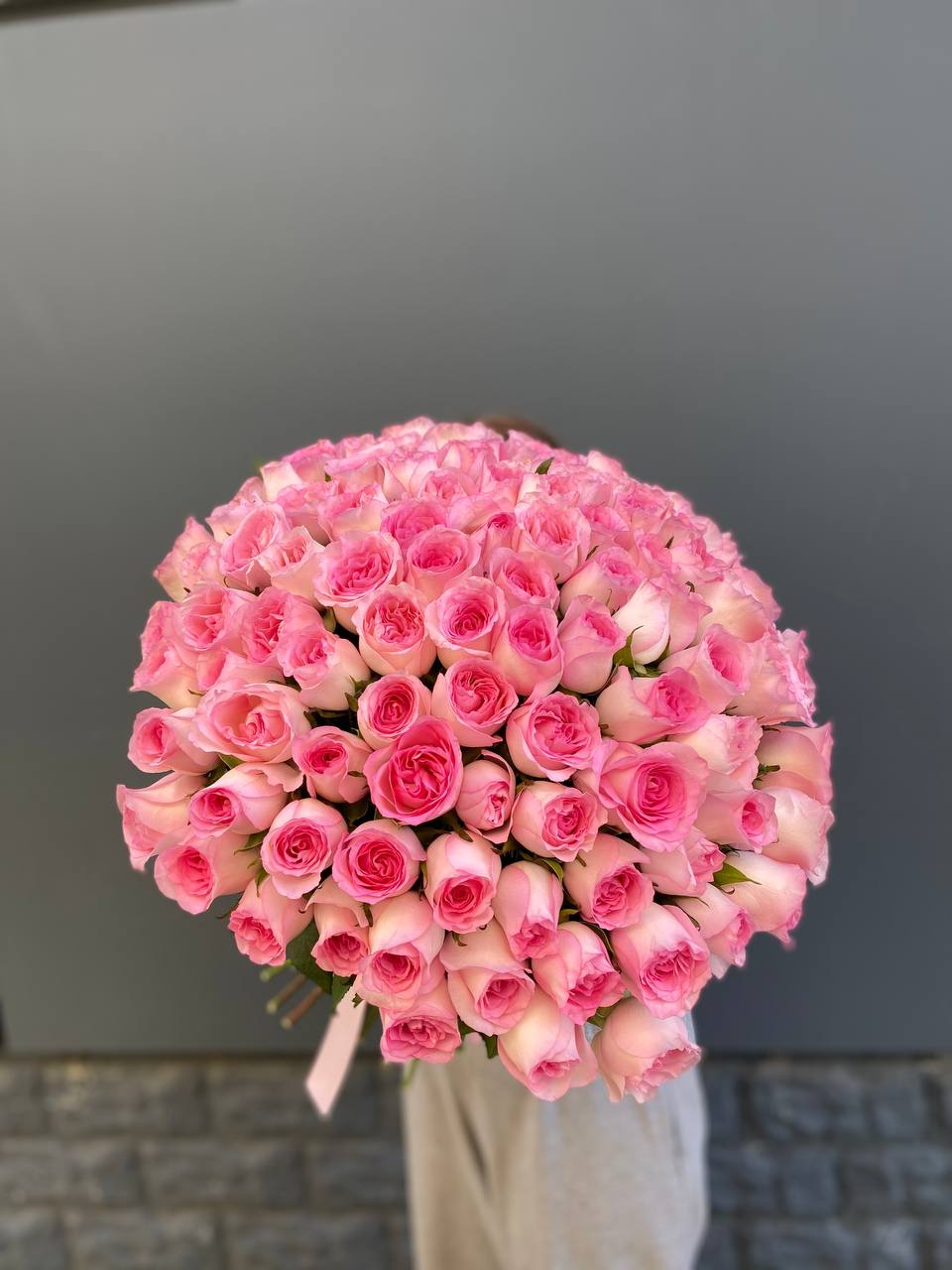 Сто один бутон кенийского пионовидного сорта собраны в масштабную композицию. Белая окантовка лепестков переходит в розовый центр. Впечатляющее присутствие в любом пространстве.