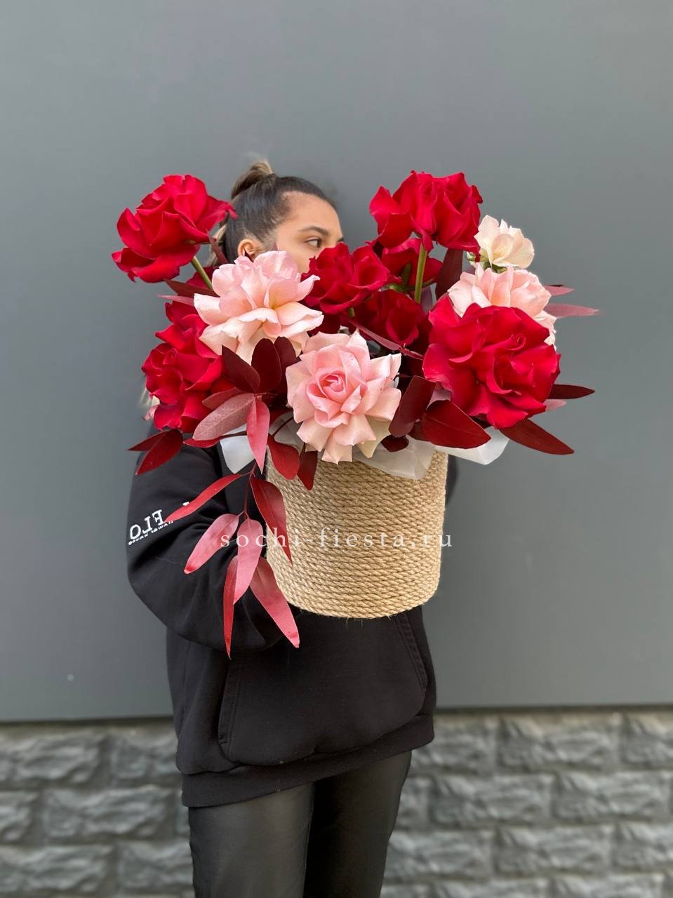 Двадцать одна роза глубокого красного оттенка собрана в плотную композицию с бордовым амарантом и натуральными сухоцветами. Насыщенность цвета создает выразительный образ, а округлая коробка сохраняет форму и свежесть бутонов надолго.