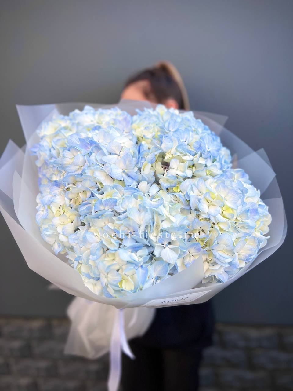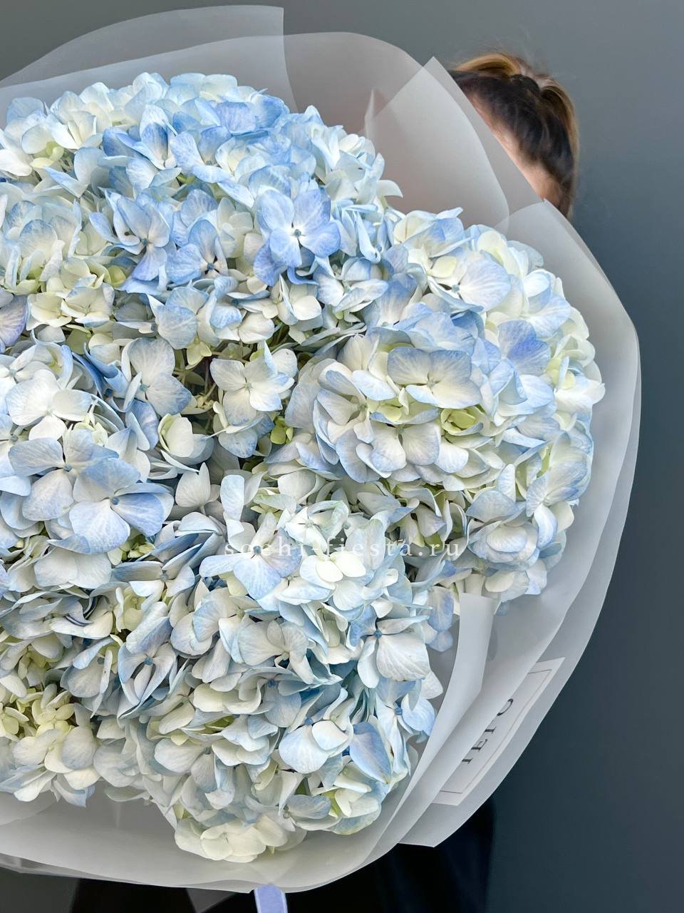 Пять соцветий необычного голубого оттенка образуют воздушную композицию. Гортензии притягивают взгляд своей редкой палитрой и мягкой фактурой. Монобукет для ценителей нестандартных решений.