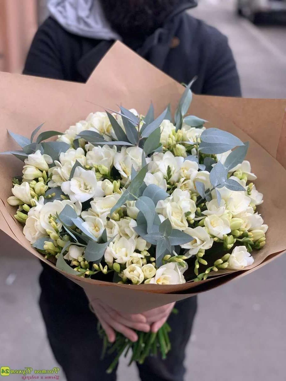 Состав: белая фрезия 51 шт., эвкалипт, крафт, лента