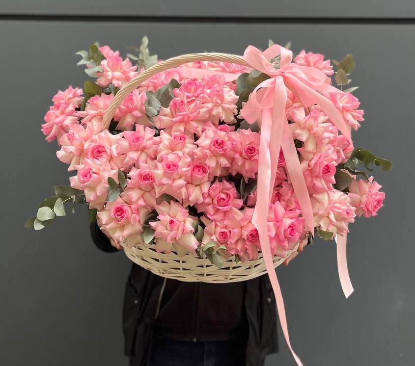 Сорок пять французских роз с вывернутыми лепестками образуют плотную композицию в плетёной корзине. Джумилия раскрывается широко и создаёт объёмную фактуру с глубокими переливами оттенков.