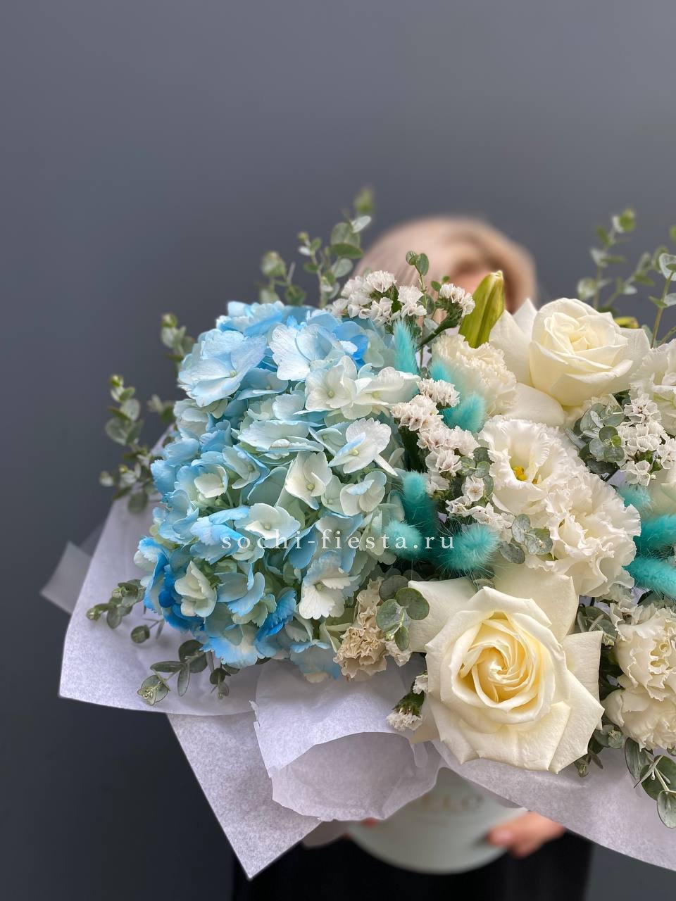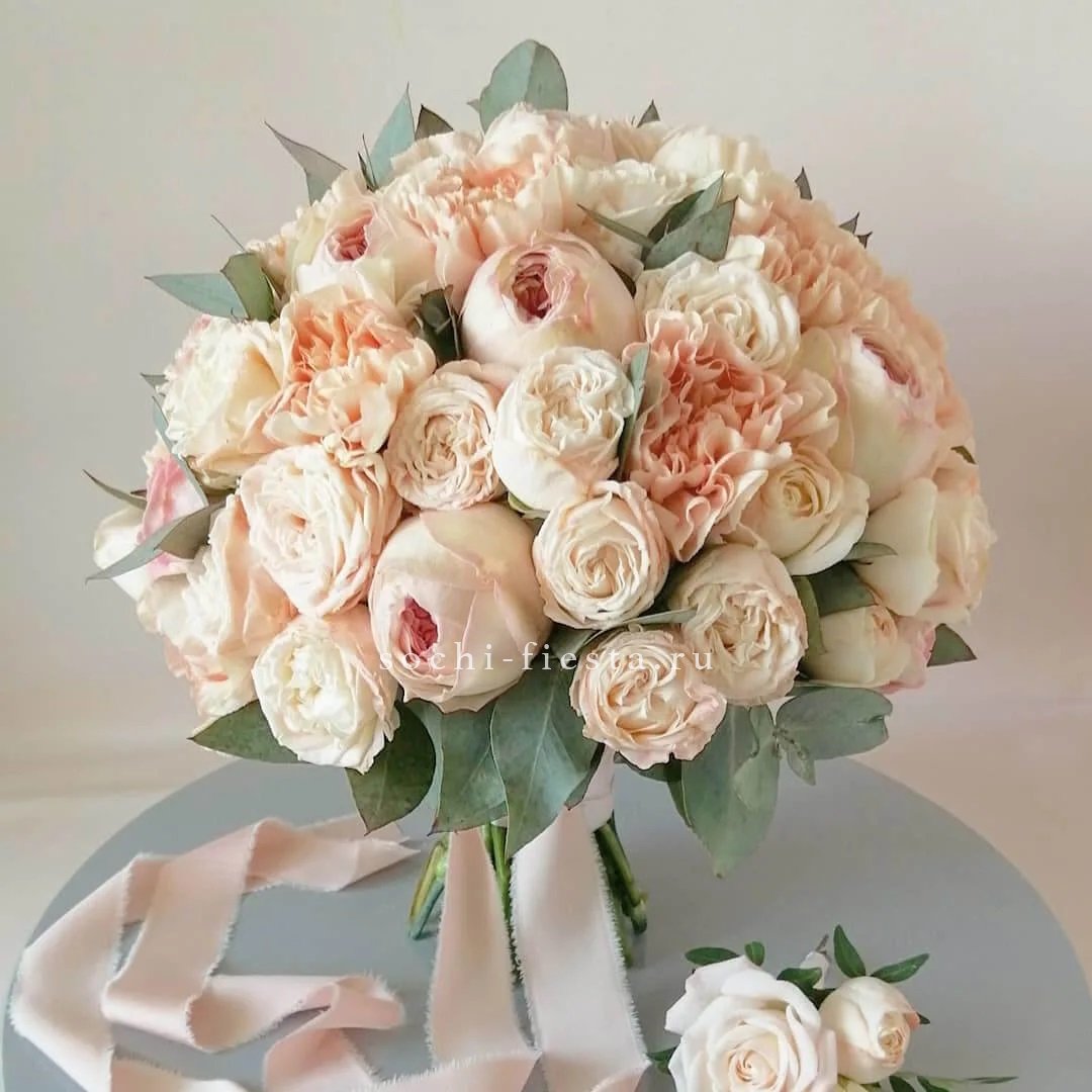 Одиннадцать вывернутых бутонов WhiteNice раскрываются волнами лепестков с матовым свечением. Эвкалипт добавляет воздуха между соцветиями.