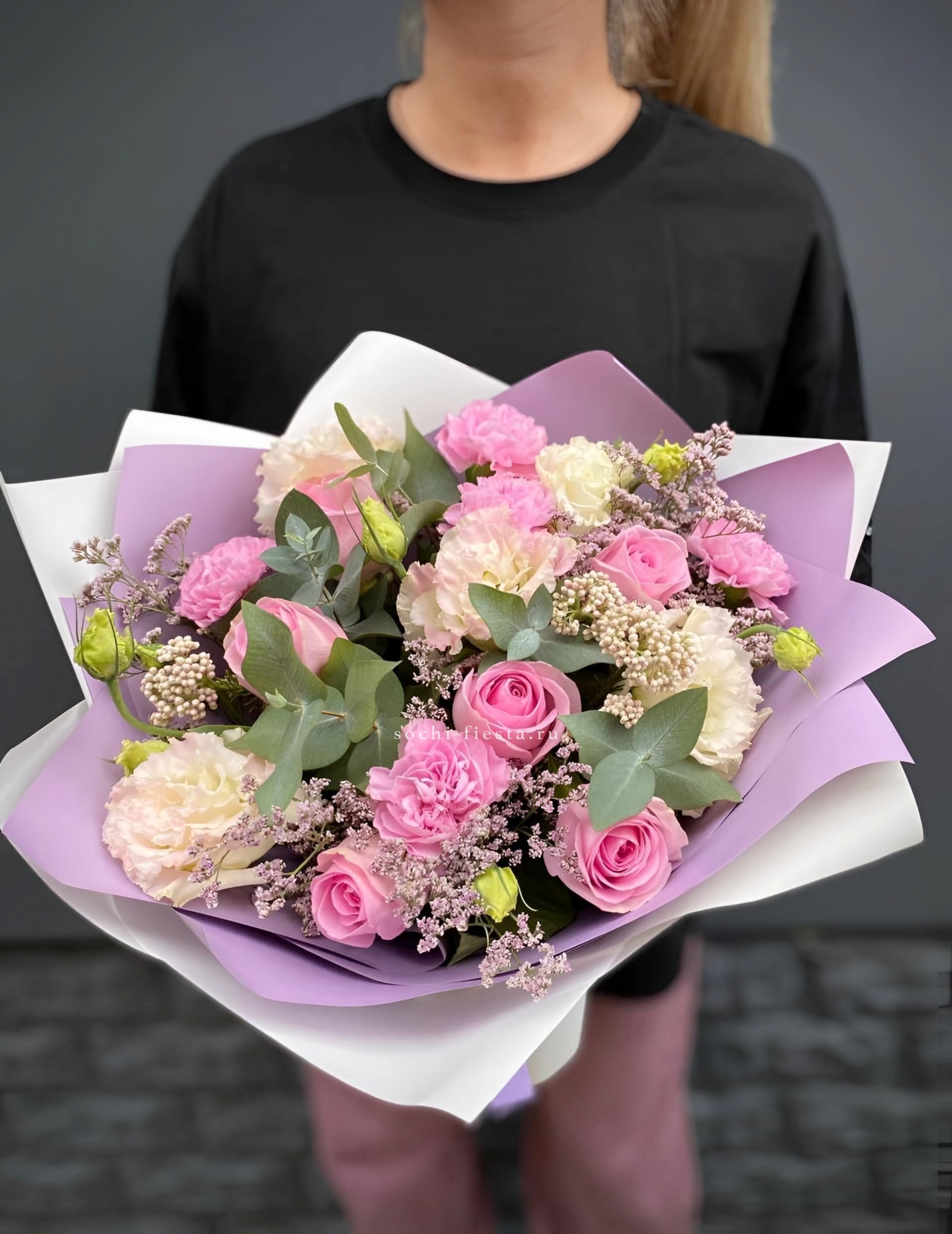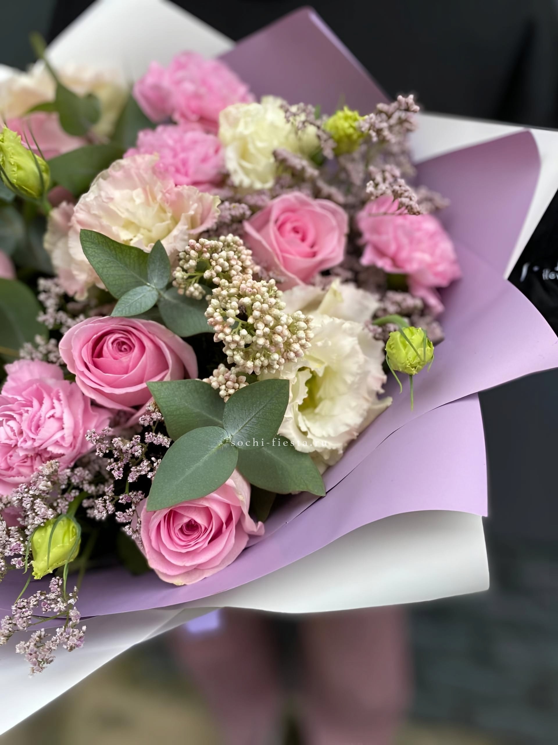 диантусы, эустома, розовые розы, лимониум(или аналог), озатамус, эвкалипт, упаковка.