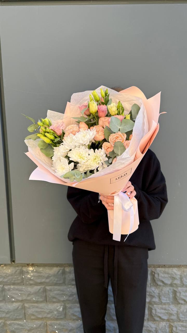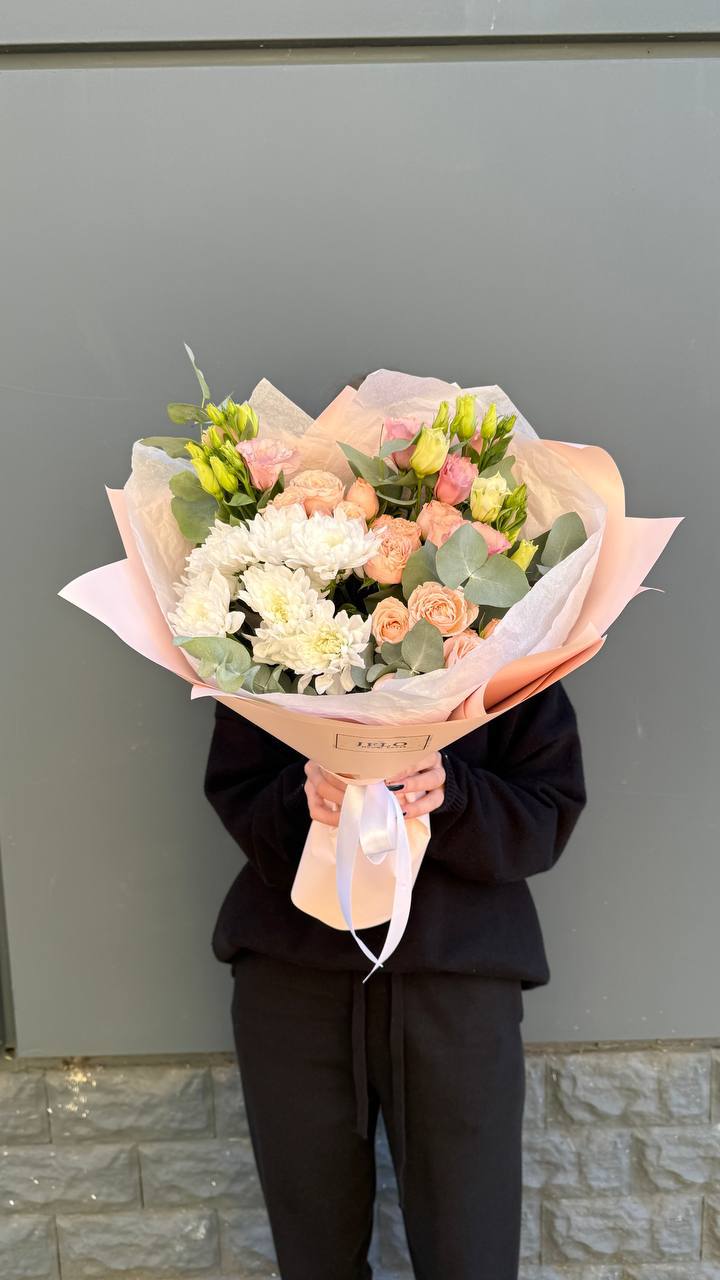 Авторский микс в персиковых тонах — идеальное дополнение к вашему особенному дню. Сочетание фактурных хризантем и бархатистых роз создает ощущение легкости и тепла. Букет, который не просто украшает пространство, а дарит искреннюю улыбку.