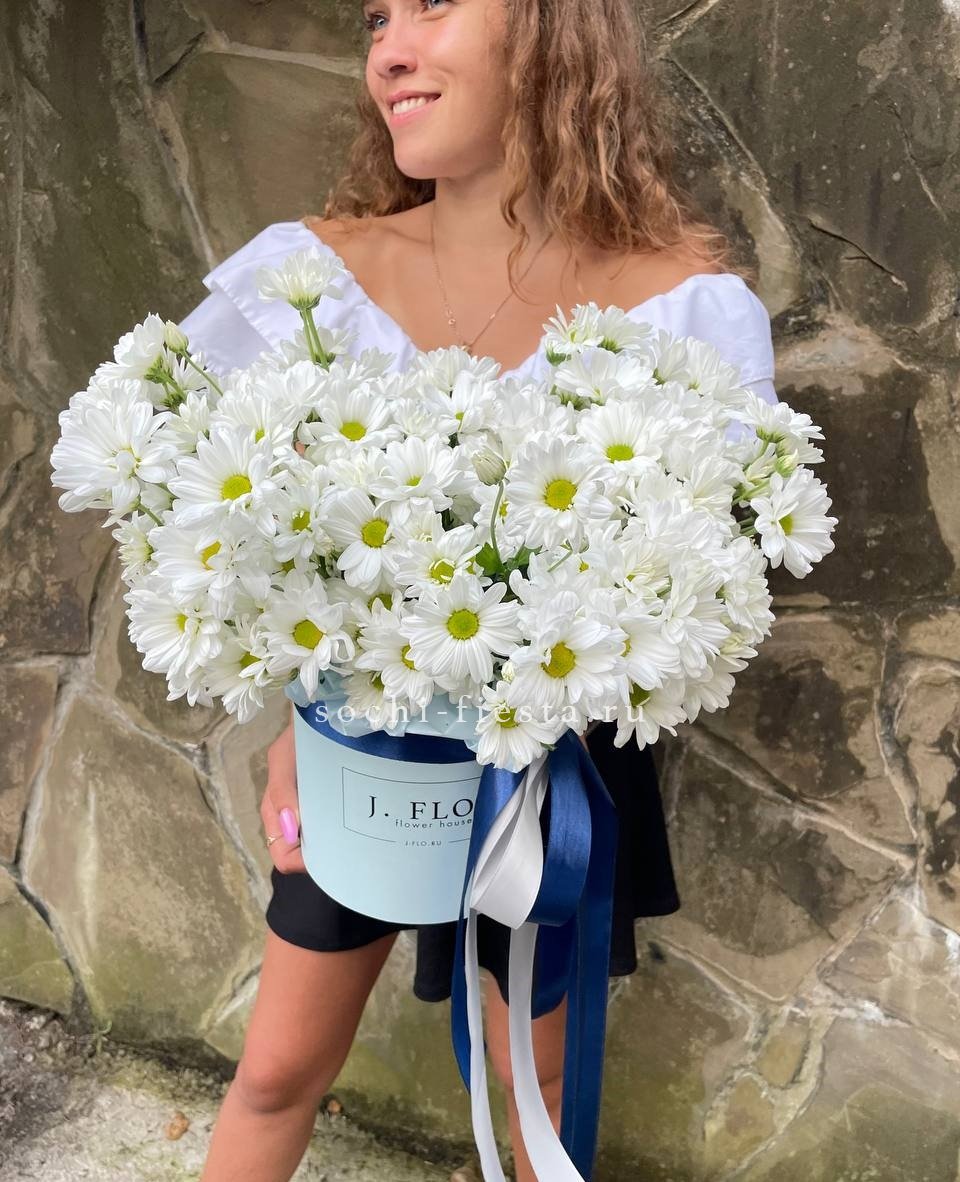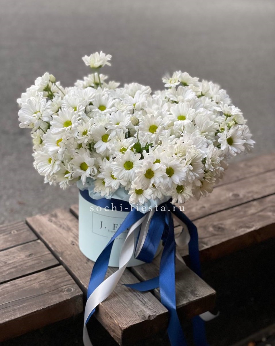 Асимметричная форма напоминает изгиб полумесяца: кустовая хризантема и гортензия собраны в плавную линию. Коробочки хлопка смягчают силуэт и добавляют фактурности краям букета.