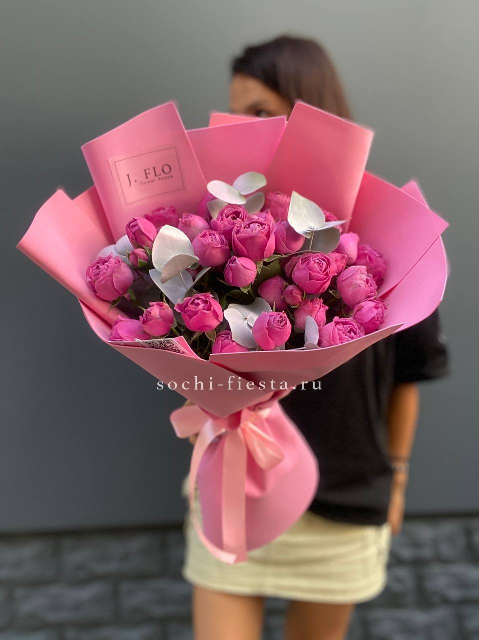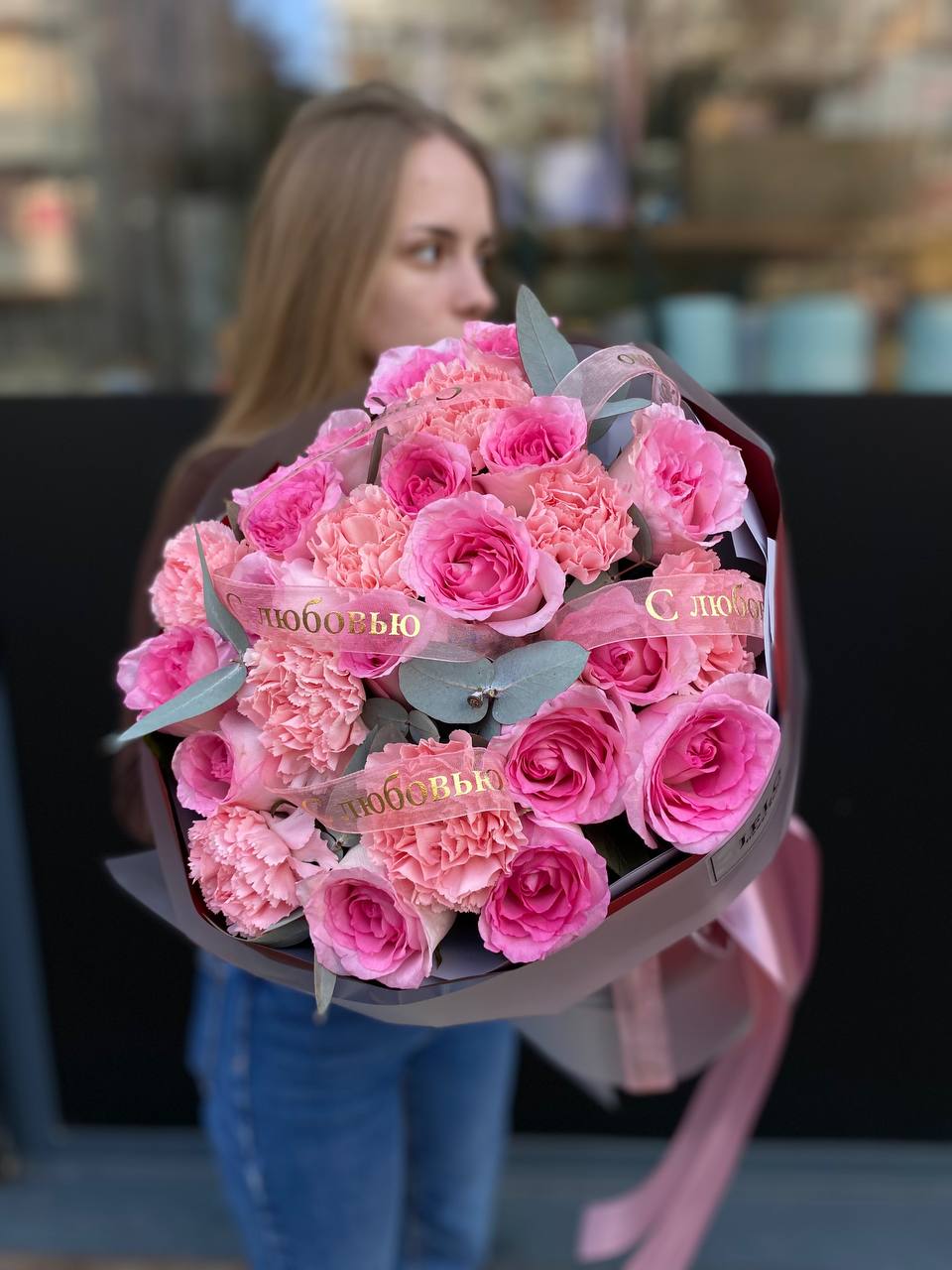 Розовые розы собраны плотной полусферой, где каждый бутон раскрывается навстречу свету. Диантусы добавляют воздушности, а эвкалипт мягко обрамляет композицию. Букет, который говорит без слов.