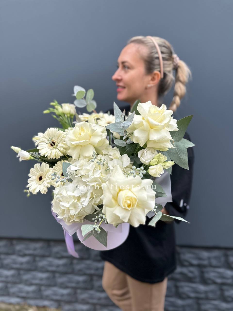 пионовидная роза, хамелациум (замена в несезон), эвкалипт, авторское оформление.