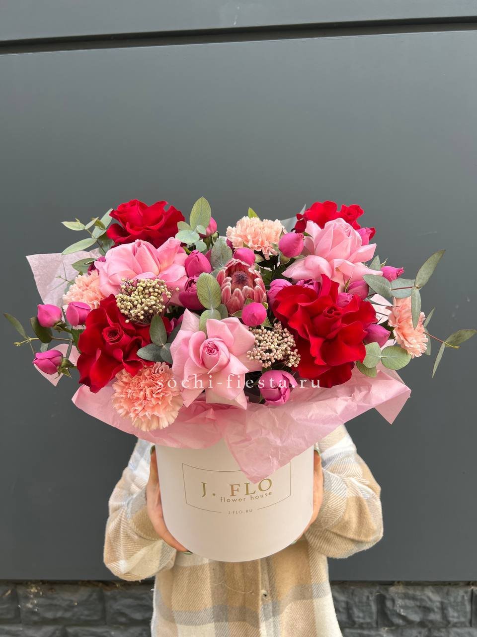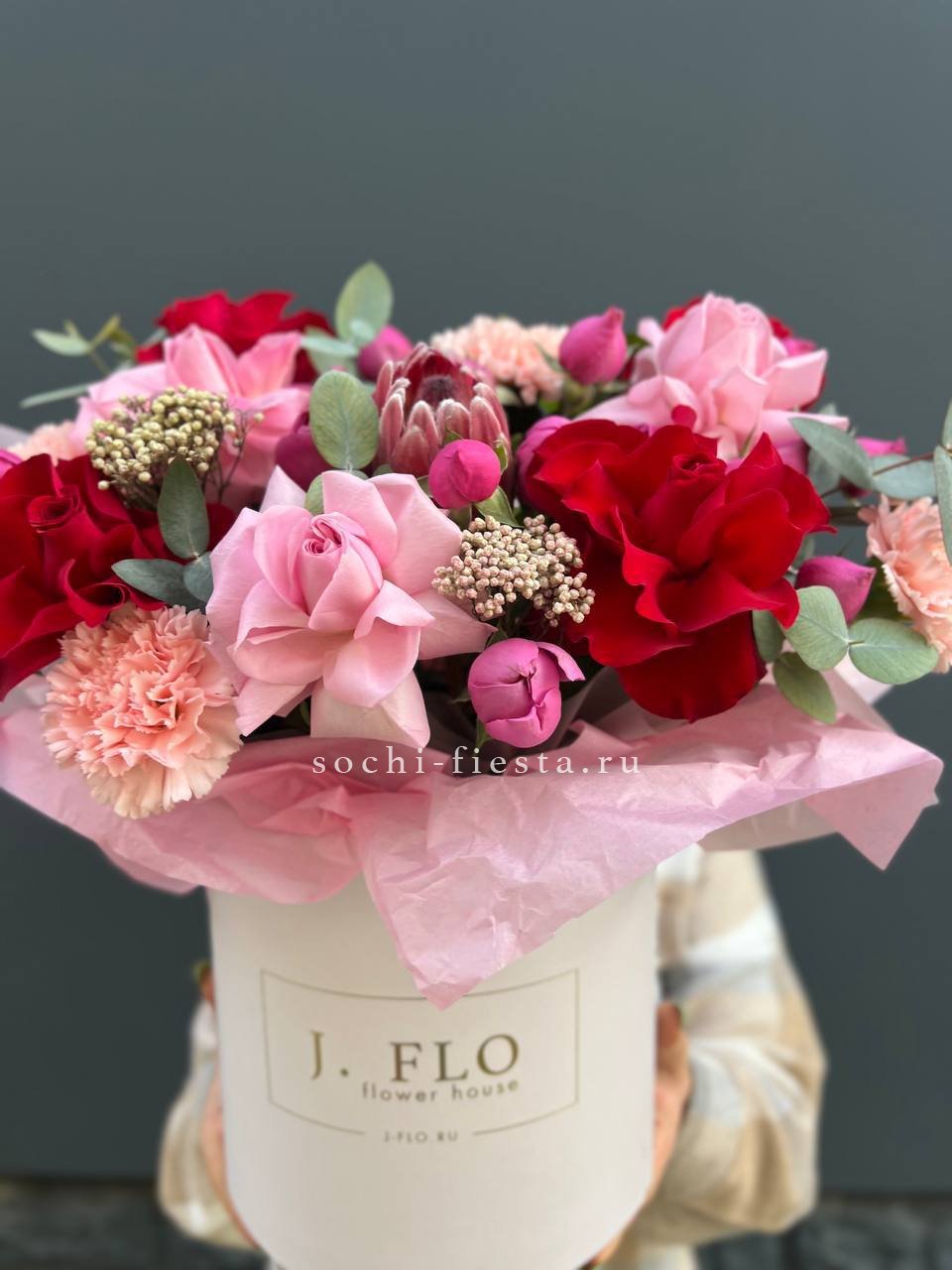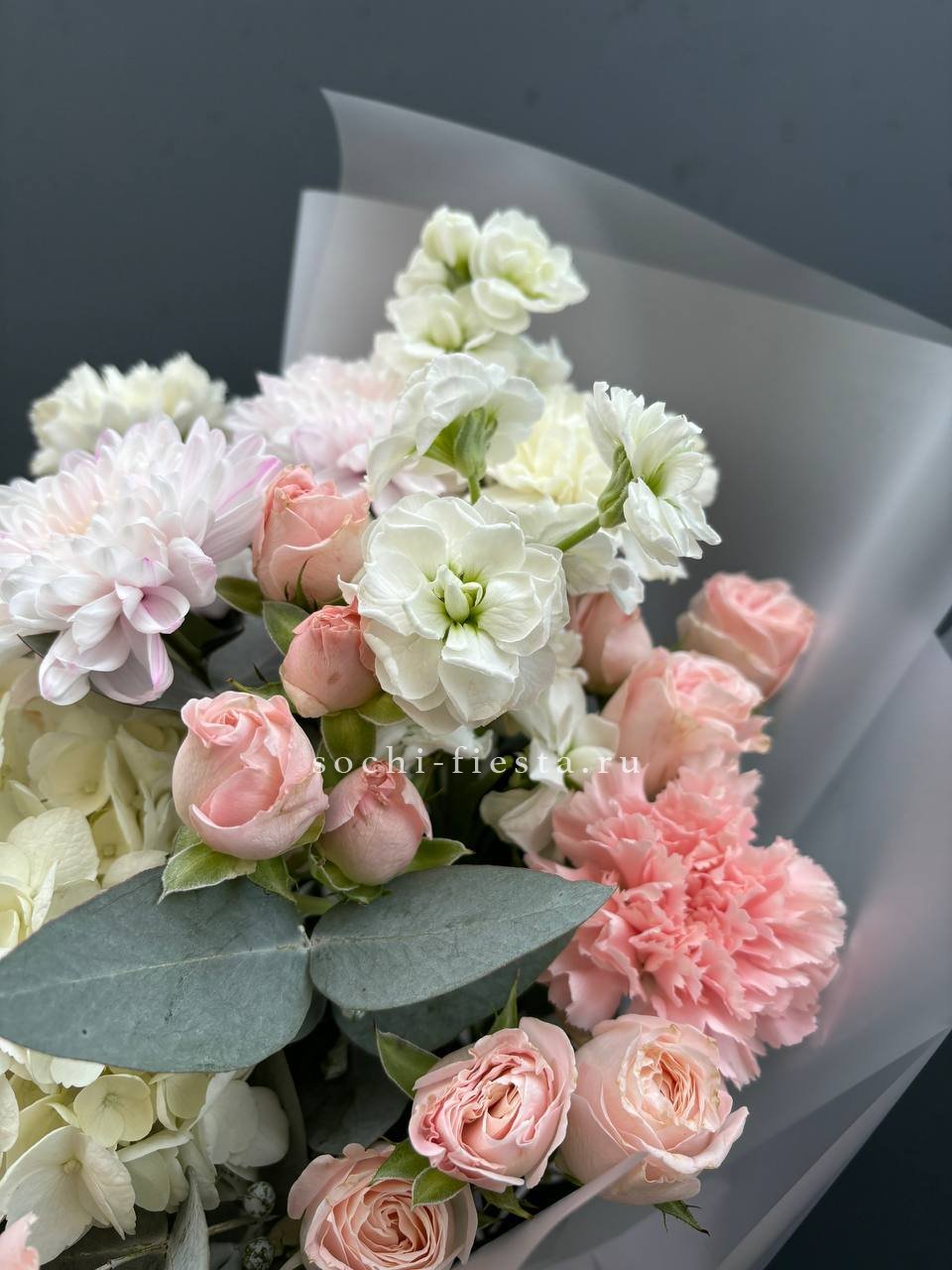 Розовые тона переплетаются с белыми вкраплениями гортензии. Кустовые розы и маттиола дополняют объемную композицию свежими акцентами.