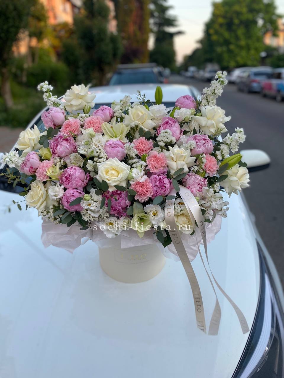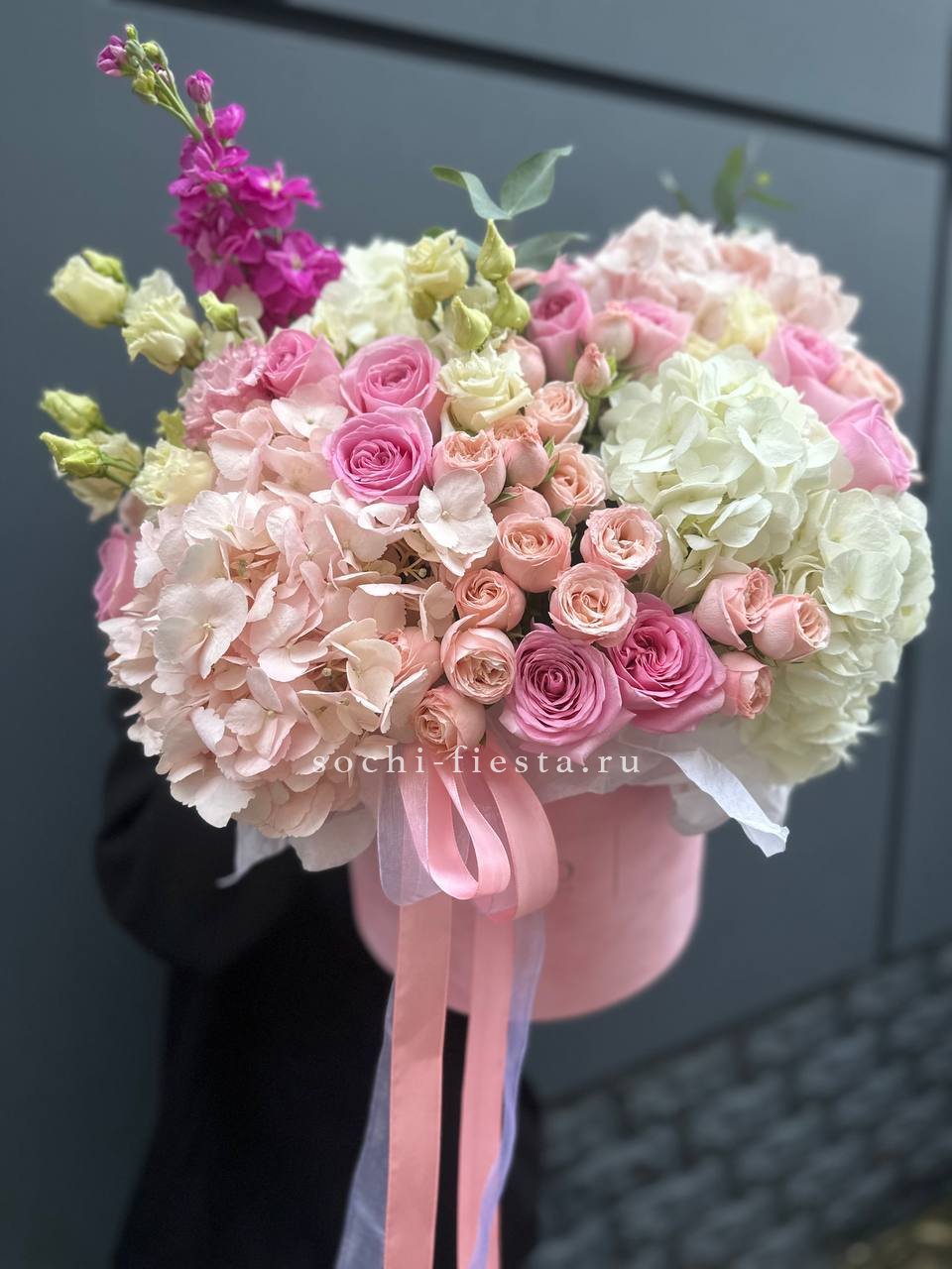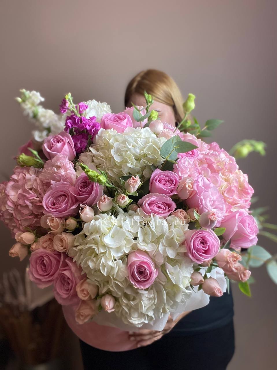 гортензия - 11 шт., пионовидная кустовая роза Мисти Баблс 7 шт., лента, дизайнерская упаковка.