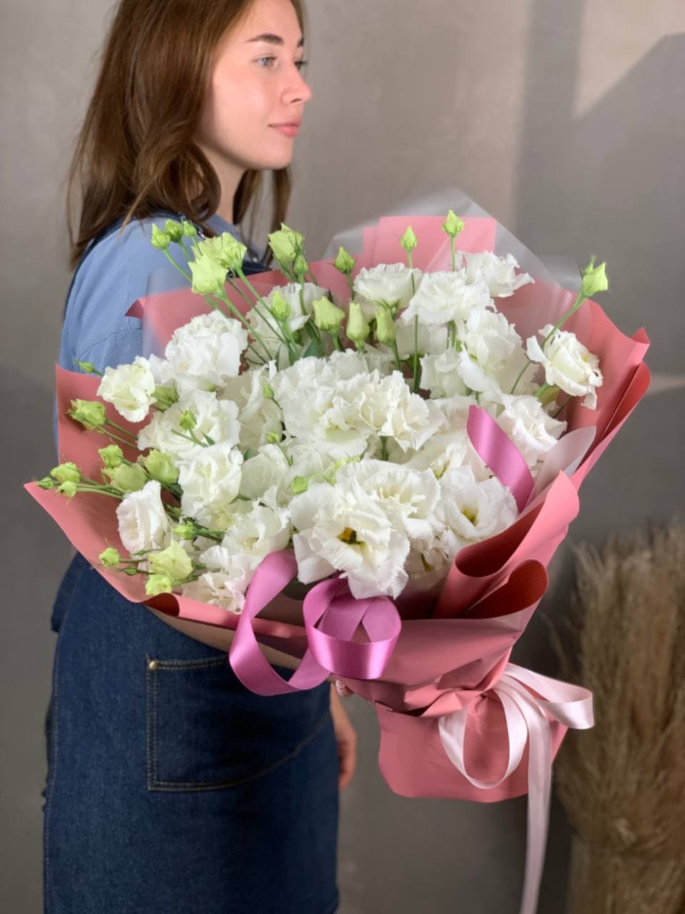 Пятнадцать воздушных эустом собраны в пудровое облако с мягкими переходами оттенков. Многослойные бутоны создают объёмную текстуру и удивительную глубину композиции.