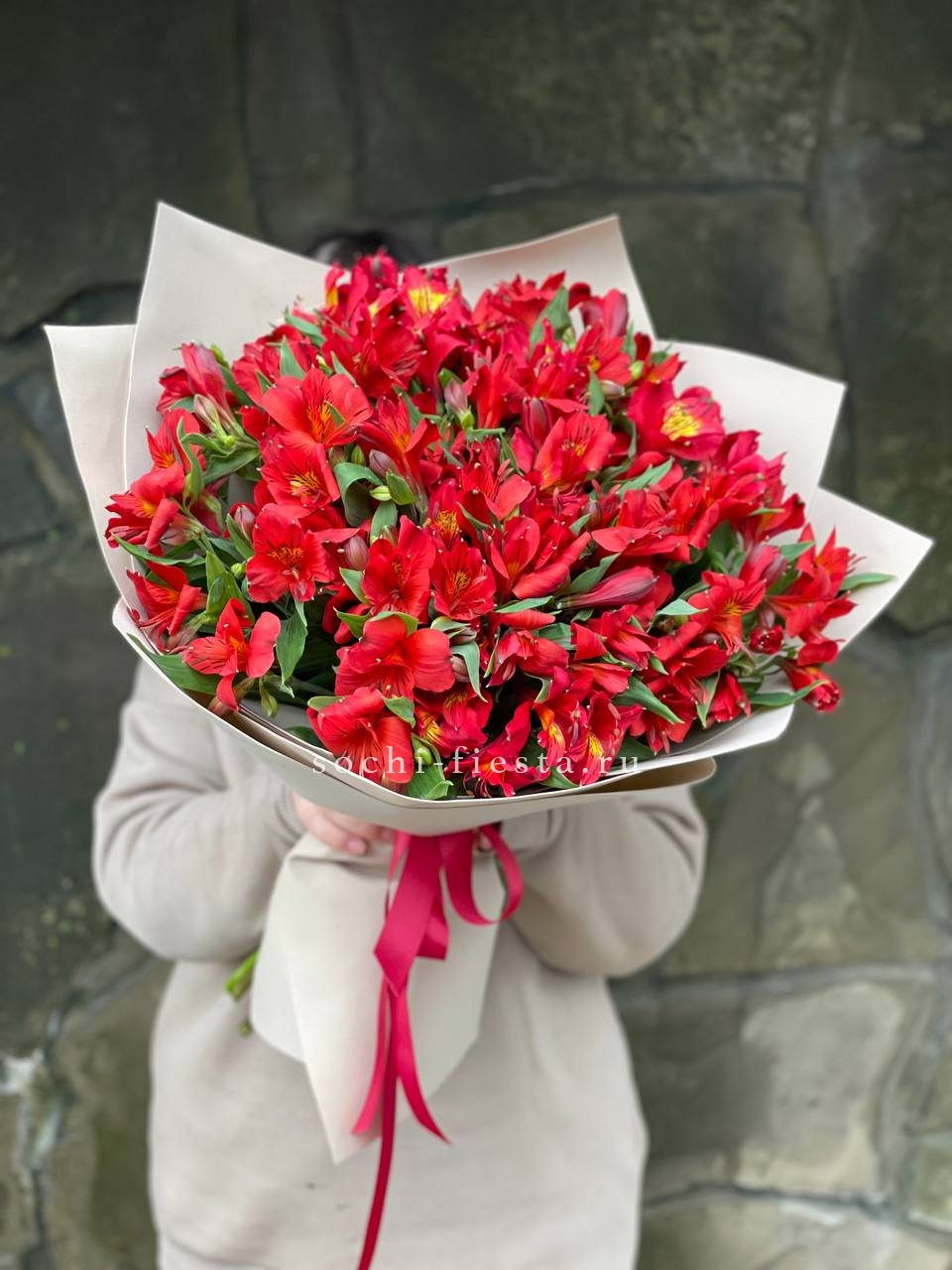 Букет из пятидесяти одной ветки альстромерий с возможностью выбрать оттенок под настроение или интерьер. Цветы долго сохраняют свежесть и не требуют сложного ухода, оставаясь яркими и упругими.