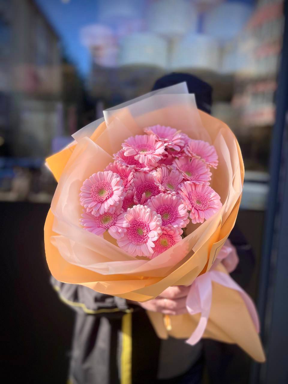 Семнадцать гербер собраны в плотный круг, где каждый цветок раскрыт полностью и направлен вперёд. Розовый оттенок переходит от пудрового по краям к более насыщенному в центре каждого бутона. Букет держит форму и легко помещается в руке.