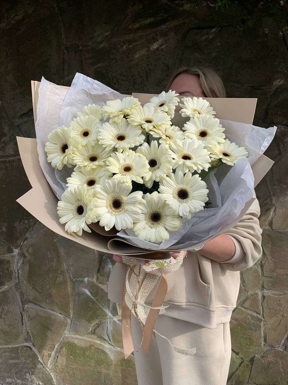 голландская гербера 7 шт., лента, дизайнерская упаковка Оттенок гербер может быть согласован с заказчиком.