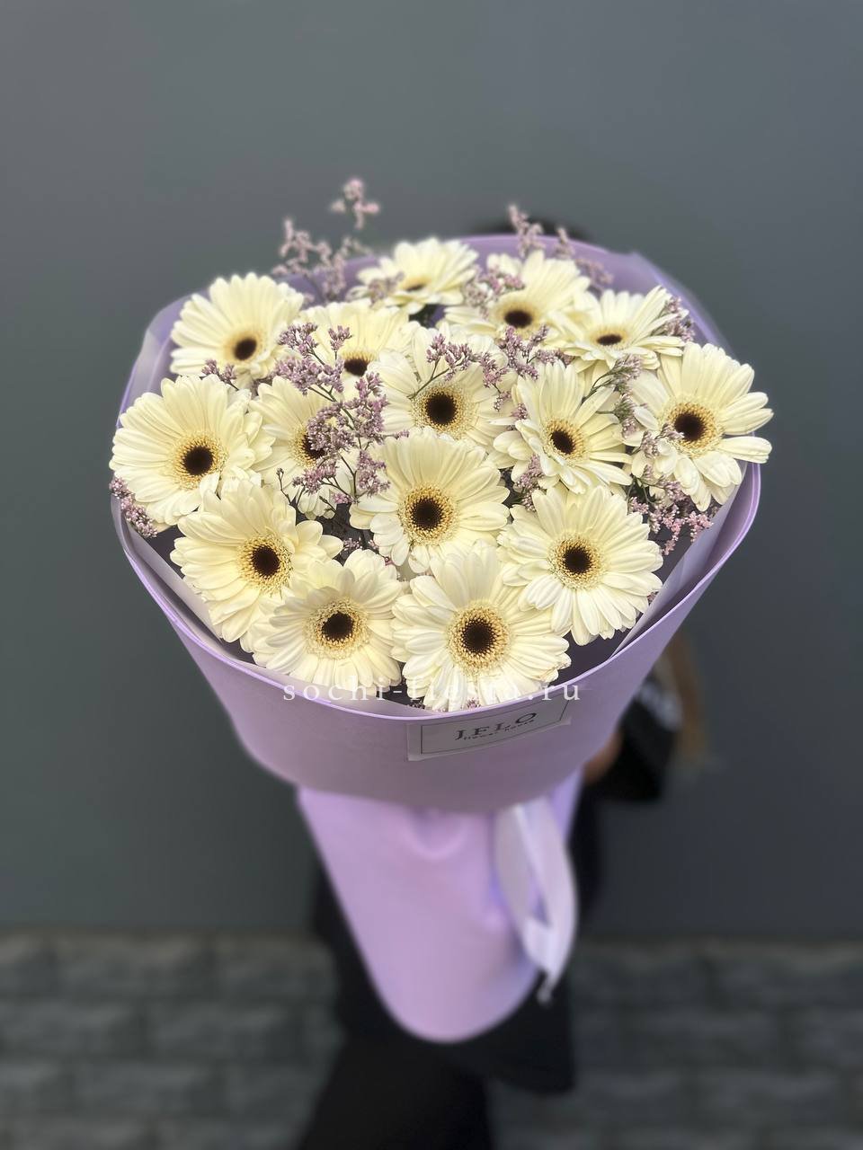 голландская гербера 15 шт., лимониум,  лента, дизайнерская упаковка.