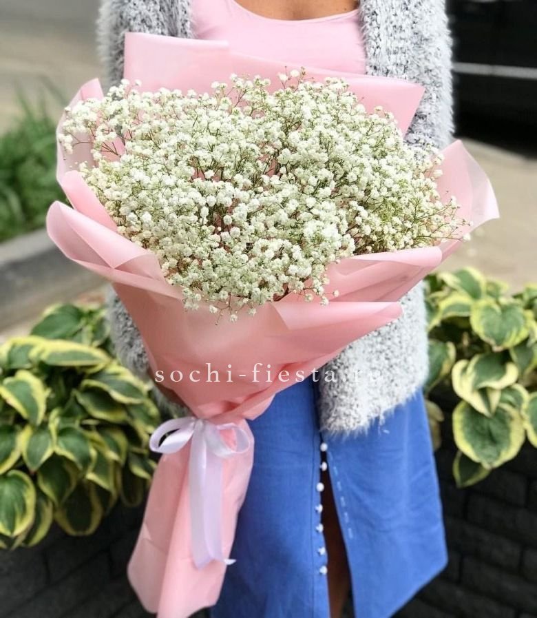 5 радужных голландских гипсофил, лента, комбинированная упаковка, оазисы.