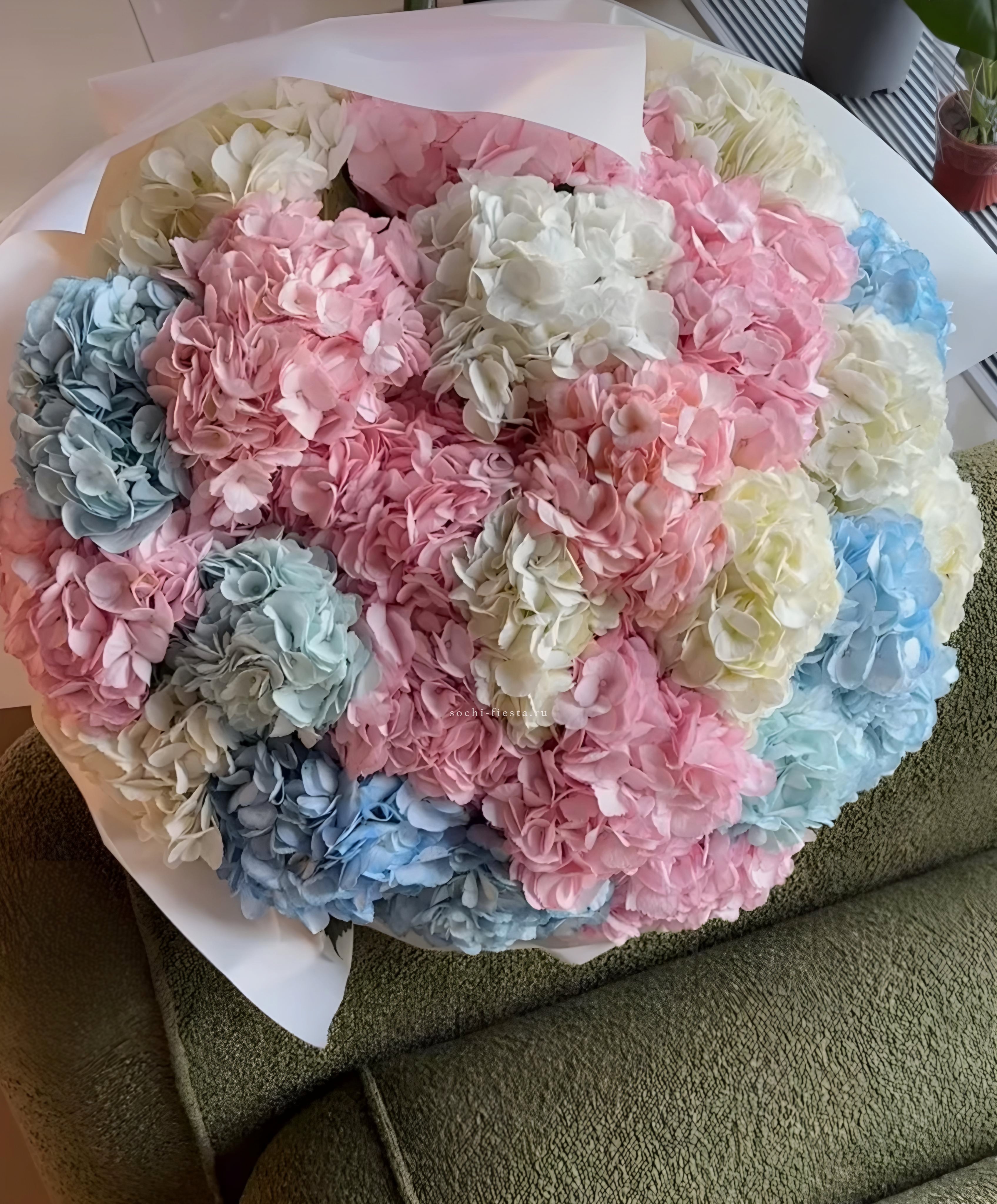 Двадцать пять соцветий гортензий разных оттенков формируют пышное облако с естественной игрой цвета. Каждая головка раскрывается по-своему, создавая живую фактуру без четких границ между тонами.