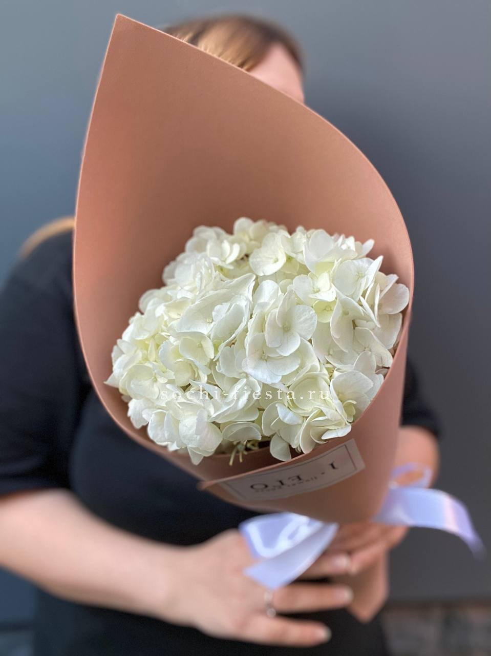 Белоснежное соцветие гортензии с плотной структурой и чистым тоном. Универсальный вариант для минималистичных интерьеров и спокойных решений.