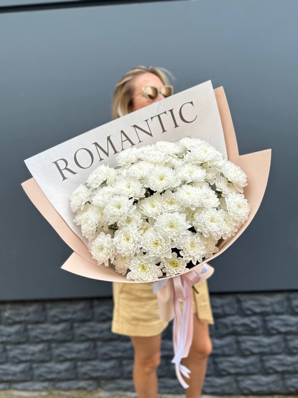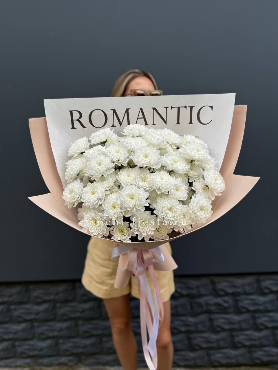 Пятнадцать веток кустовой хризантемы в натуральном крафте. Множество мелких соцветий формируют пышную шапку с естественной россыпью бутонов, подчёркнутую простотой оформления.