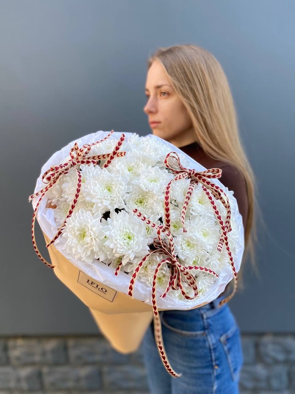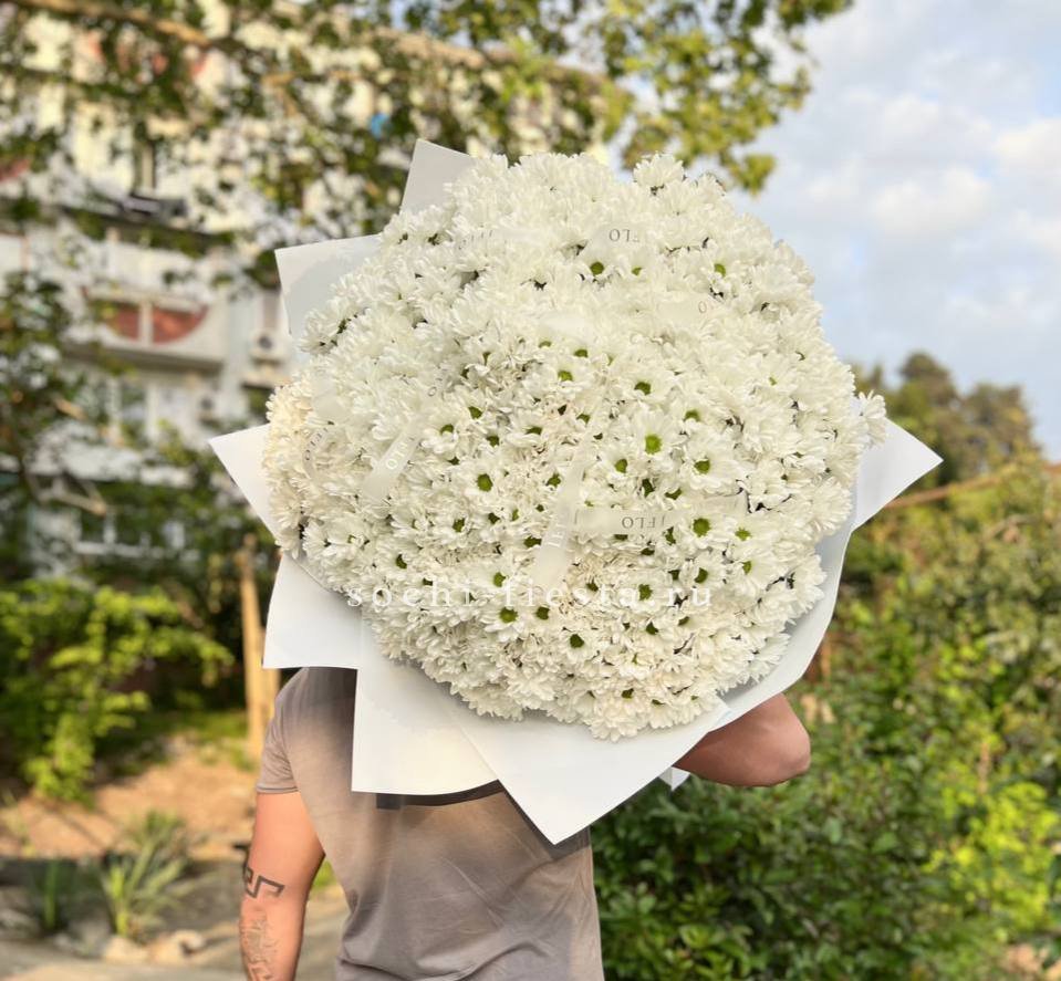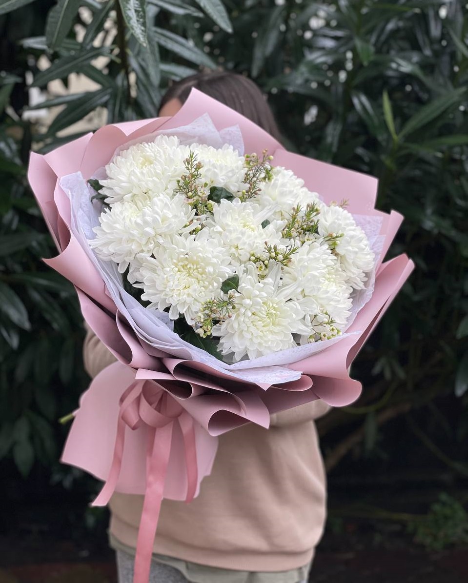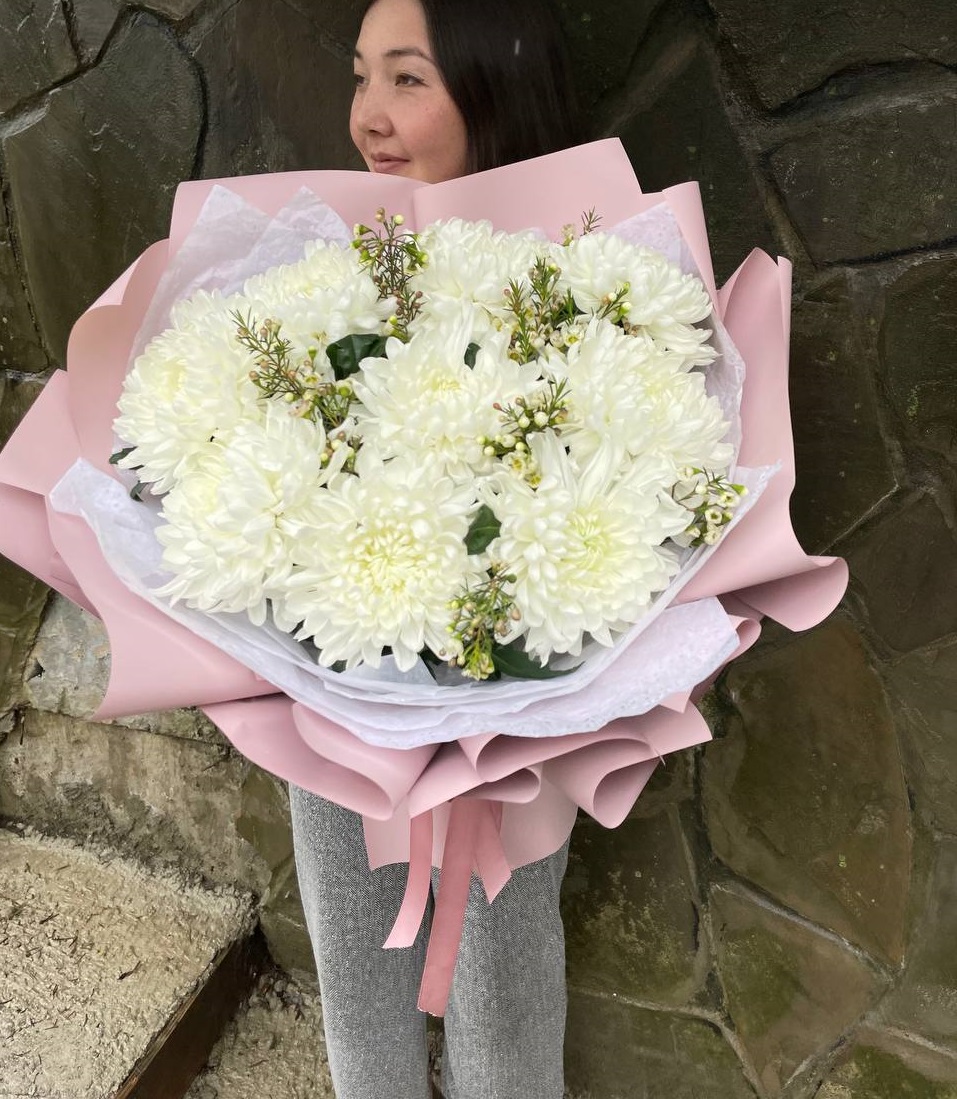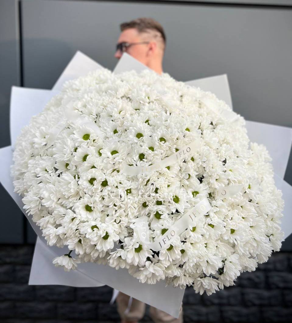 Сто одна хризантема формирует воздушное облако с мягким ритмом бутонов. Объемная композиция держит форму и наполняет пространство легким присутствием.
