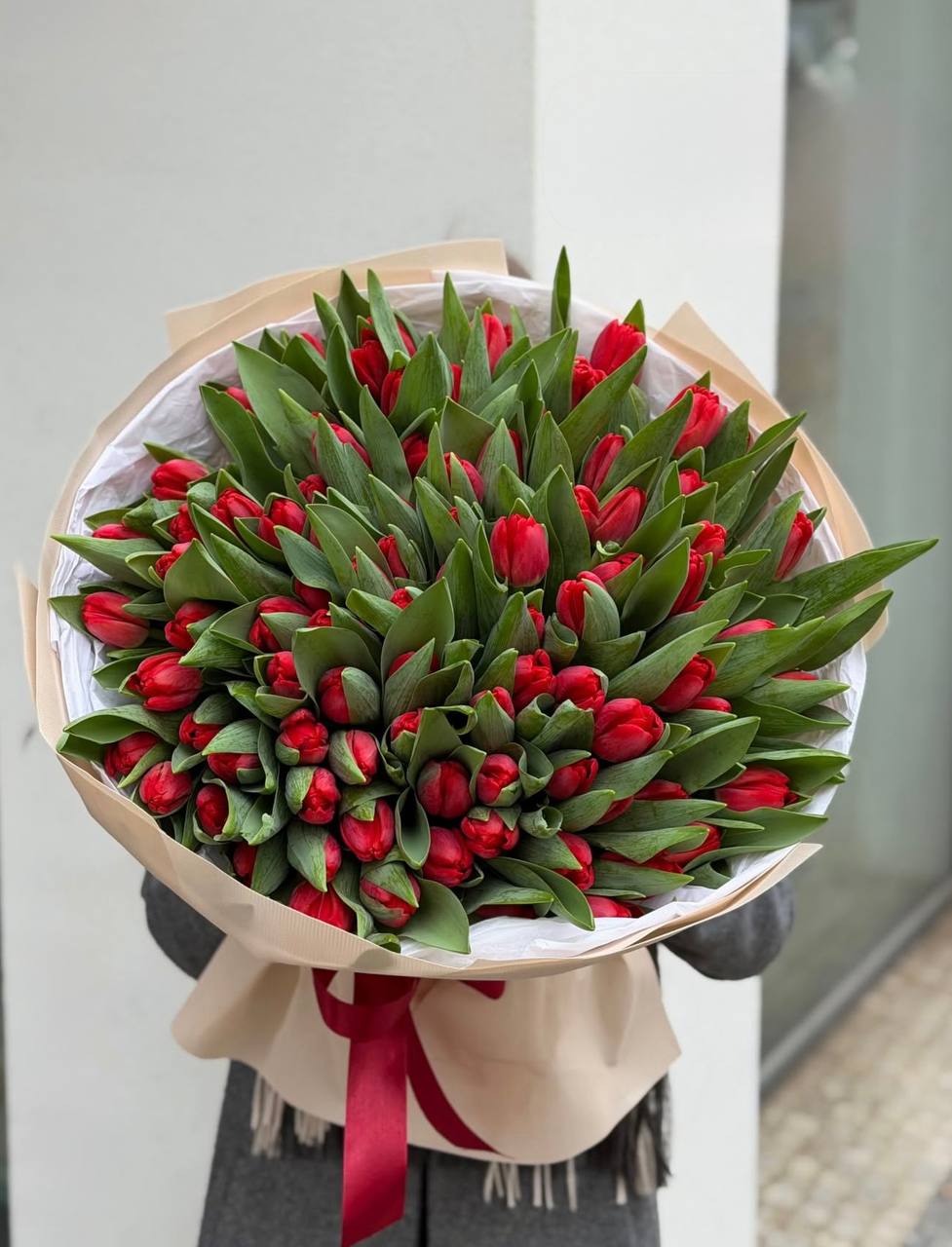 Сто один бутон собран в плотную охапку, где каждый стебель держит линию и создаёт объём. Красные головки тюльпанов образуют живую волну, которая заполняет пространство цветом и движением. Такая композиция говорит сама за себя.