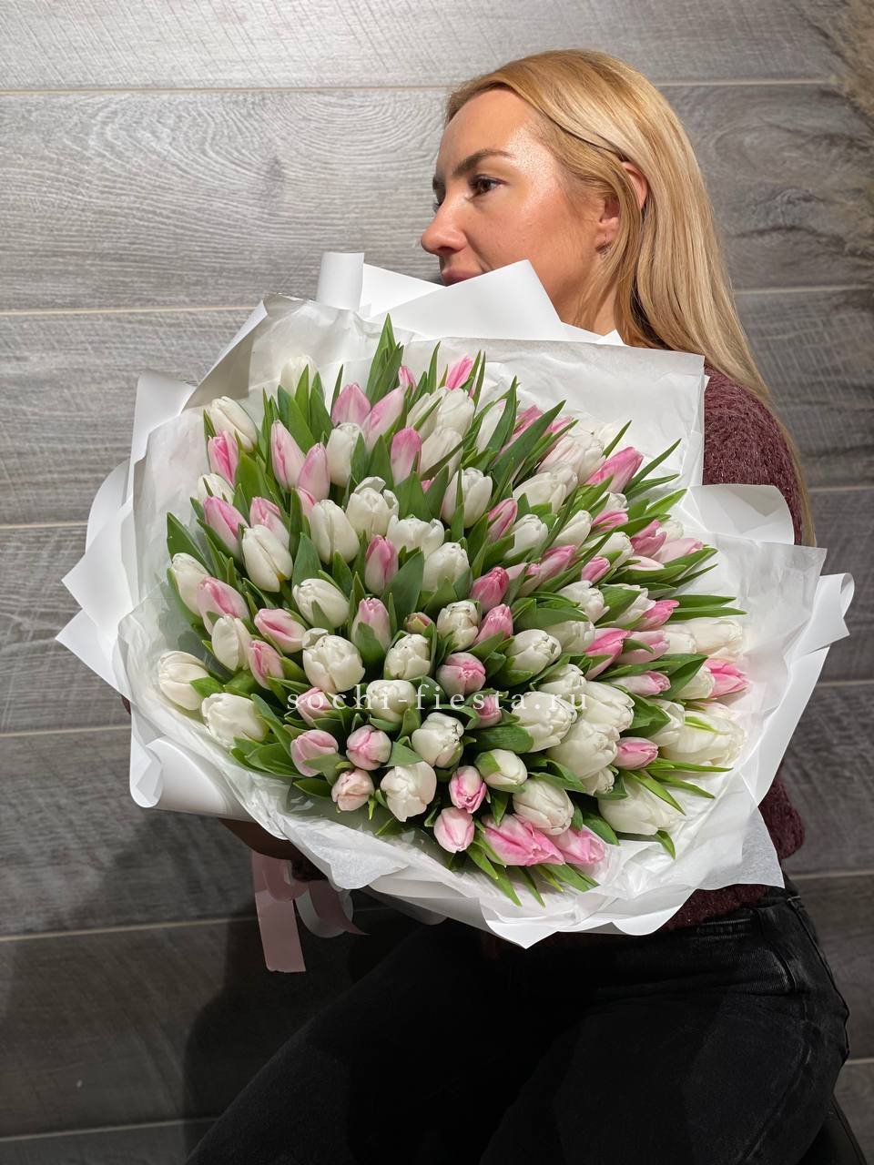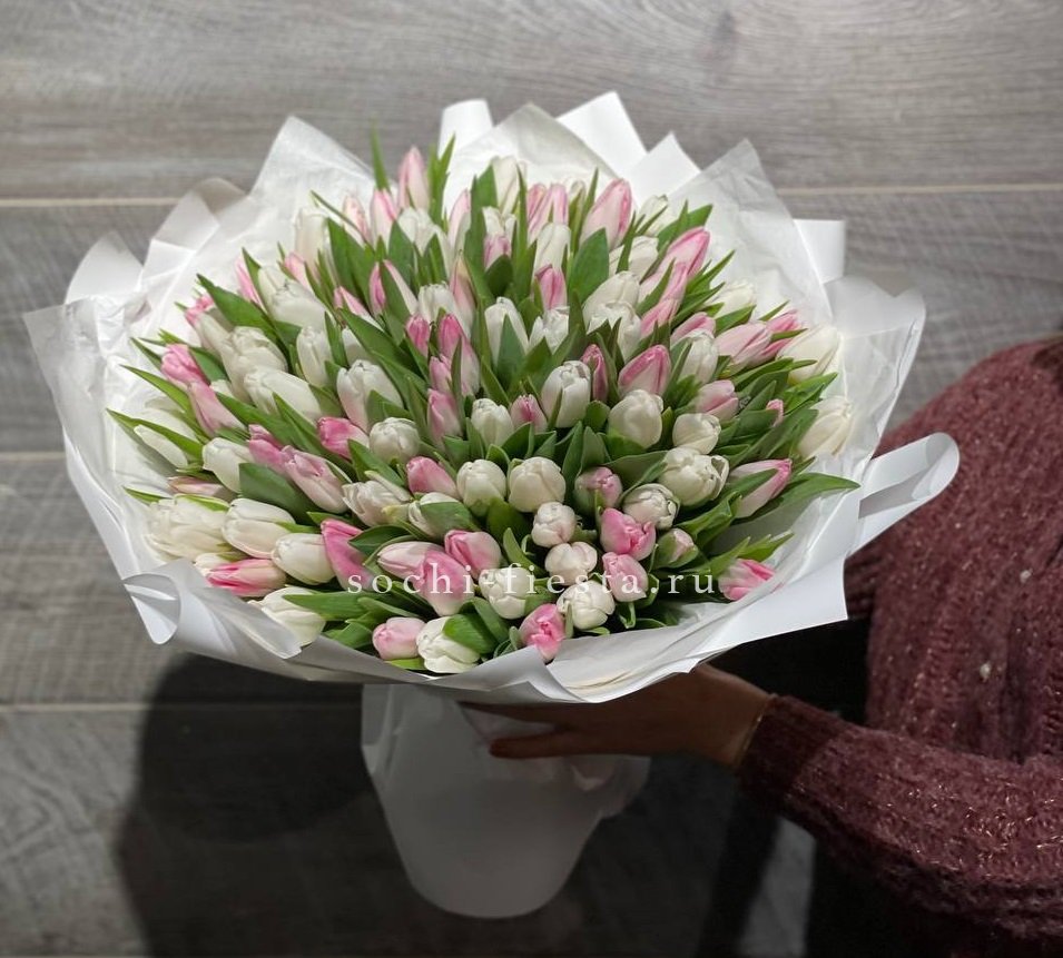 Сто один бутон в бело-розовой гамме выстраивается в объёмную композицию с плотным силуэтом. Каждый тюльпан держит свою линию, создавая ритмичную структуру букета.