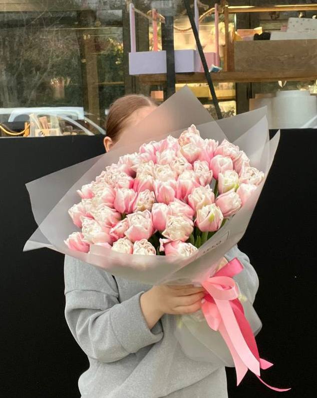Пятьдесят один тюльпан собран в плотный монохромный букет с мягкими переливами пастельных оттенков. Матовая упаковка сохраняет свежесть бутонов и создает лаконичную форму. Весенняя композиция для тех моментов, когда хочется заполнить пространство цветом и светом.