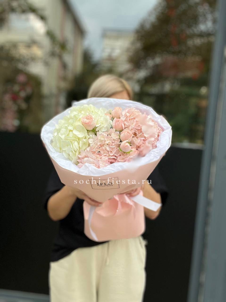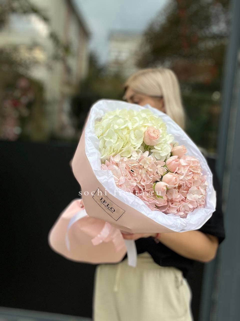 гортензия, эустома, кустовая роза, маттиола (или львиный зев), роза одноголовая, каллы (или аналог), эвкалипт, лента, упаковкаСостав букета в несозон может нести незначительные изменения.