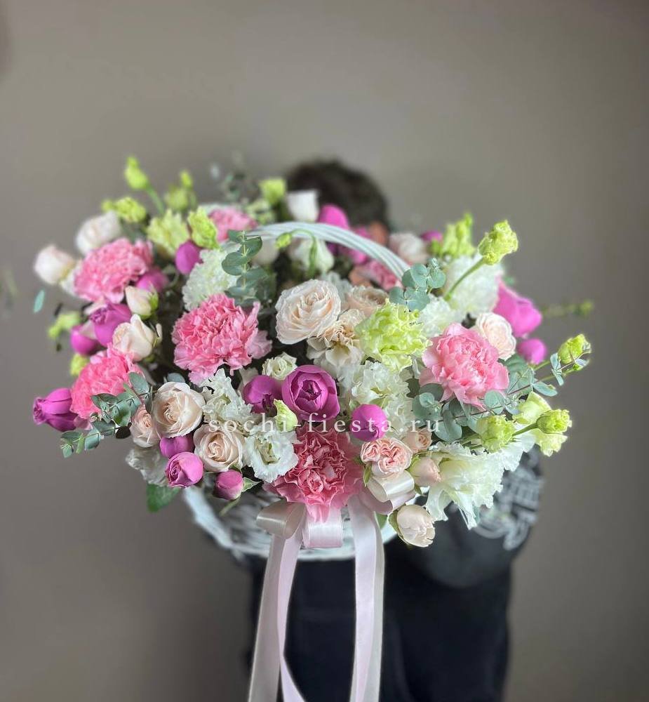 гортензия, роза пионовидная, гербер экзотический, роза одноголовая, пионовидная кустовая роза, хамелациум (или аналог), эвкалипт, дизайнерское оформление.