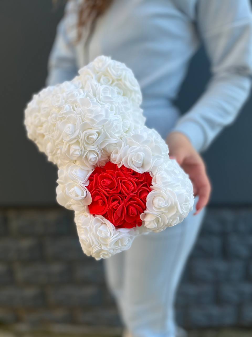 Белоснежная фигурка медведя держит яркое алое сердце. Материал фоамиран придаёт бутонам объём и стойкость формы. Выразительный акцент среди других подарков.