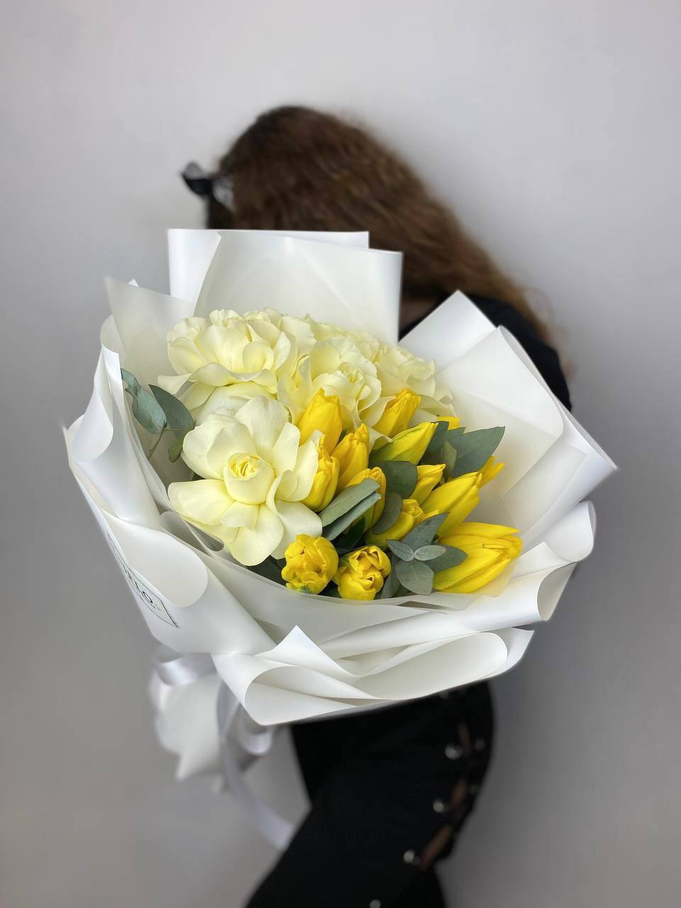 Солнечные тюльпаны переплетаются с розами в тёплой жёлтой гамме. Эвкалипт добавляет свежести и завершает композицию мягкими серебристыми нотами.