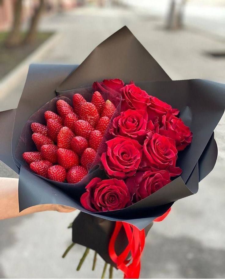 Девять роз раскрываются рядом с ягодами, создавая неожиданный ритм между классикой и свежестью. Клубника добавляет композиции сочности и летнего настроения.