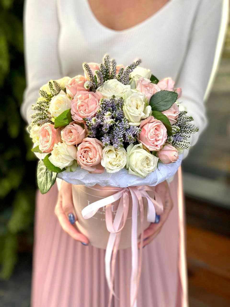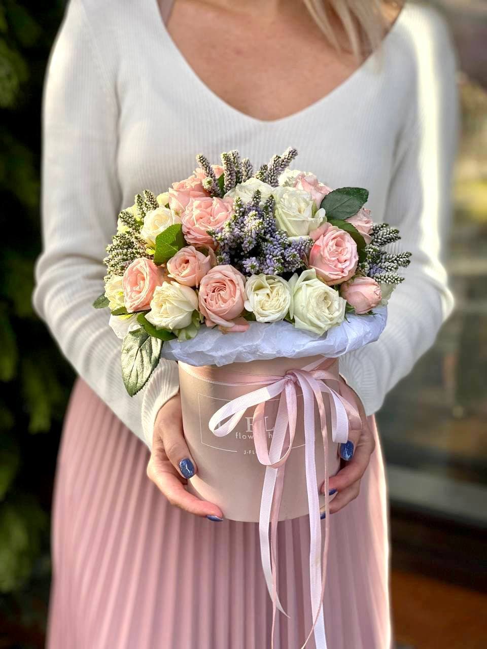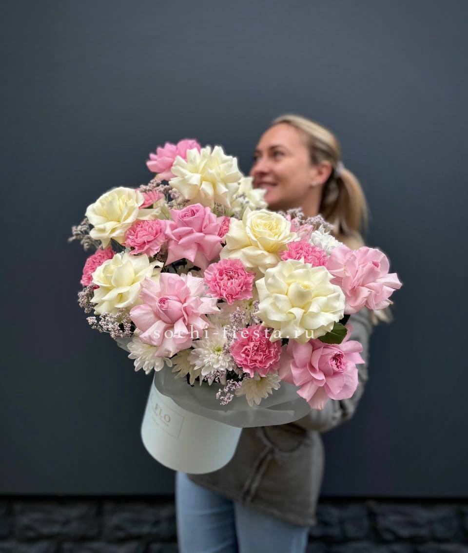 Для заказа товара "Коробка французских роз и диантусов "Бони"" с доставкой в Оренбурге нажмите в корзину