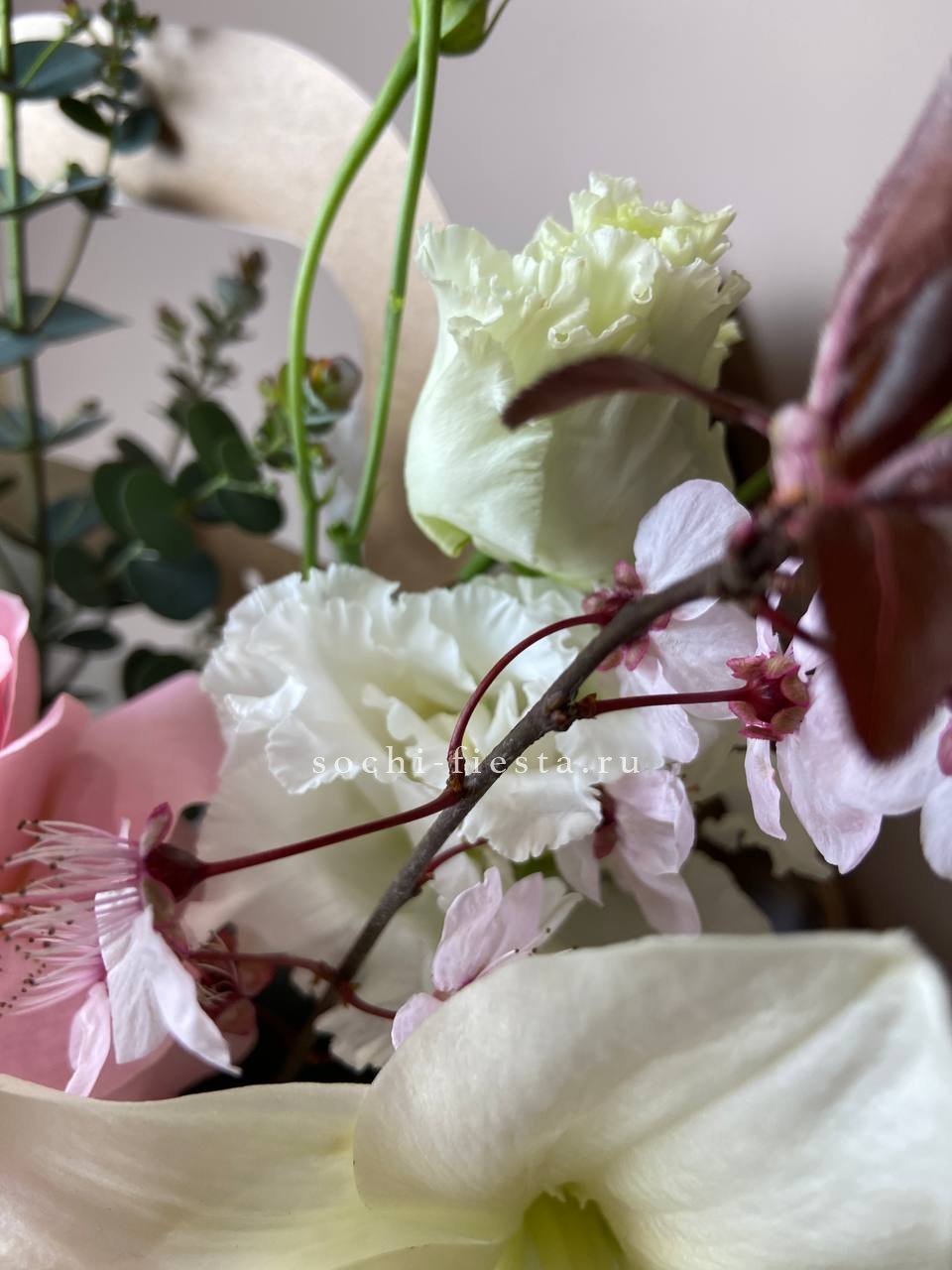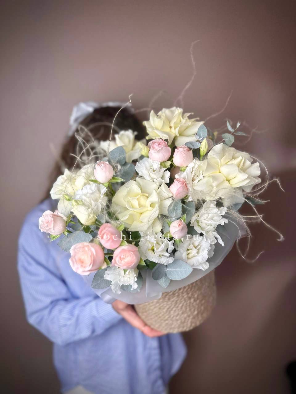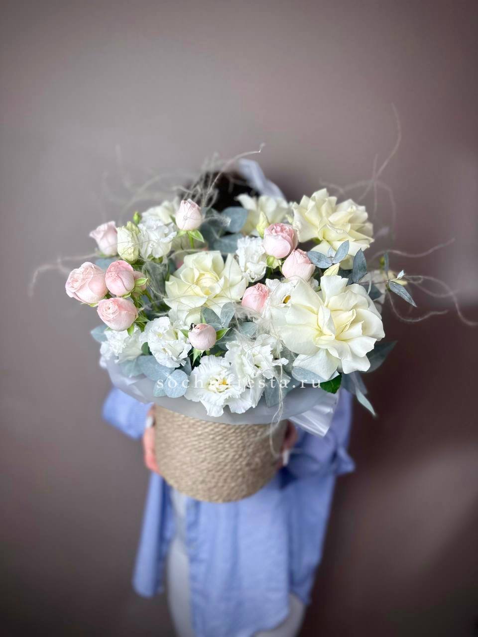 Белые розы и эустома образуют монохромную гамму с чистыми линиями. Эвкалипт добавляет свежести и завершает лаконичную форму композиции.