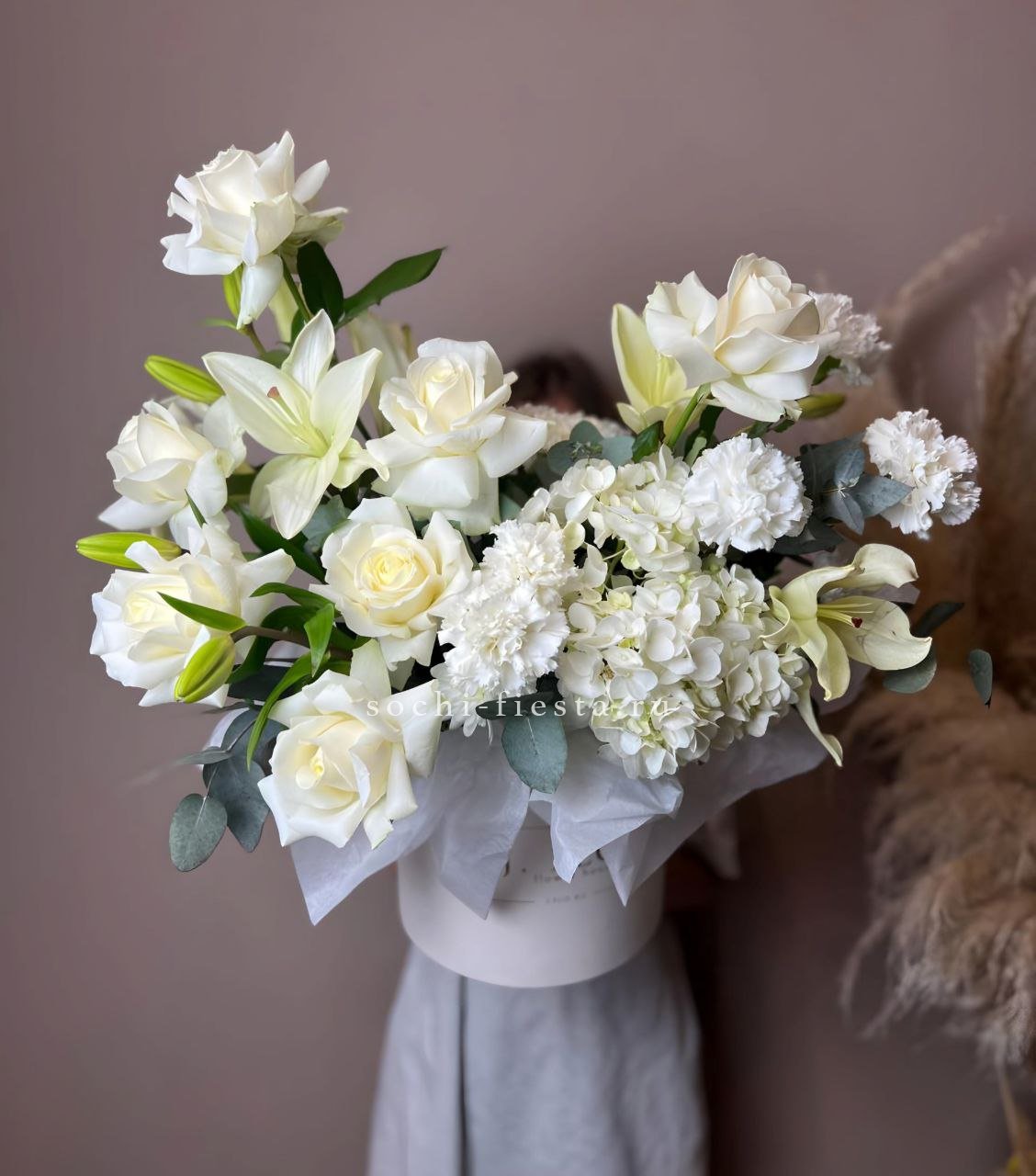 Белые розы и гортензия формируют объёмную основу, лилии вытягивают композицию вверх. Диантус и статица заполняют промежутки, создавая плотную текстуру в цилиндре.