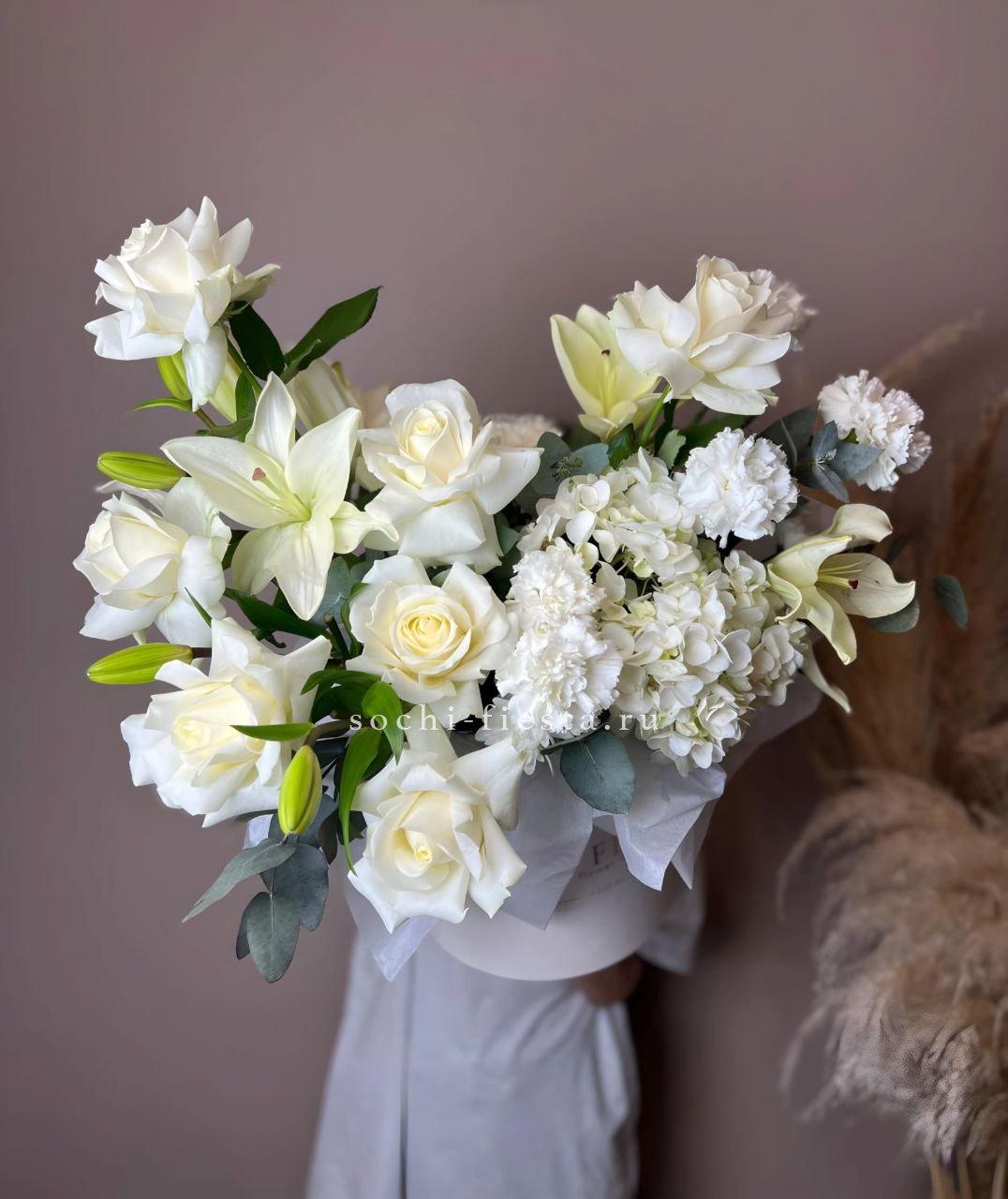 белая роза, гортензия, диантус, лилии, статица, озатамус, эвкалипт, лента, цилиндр D20.