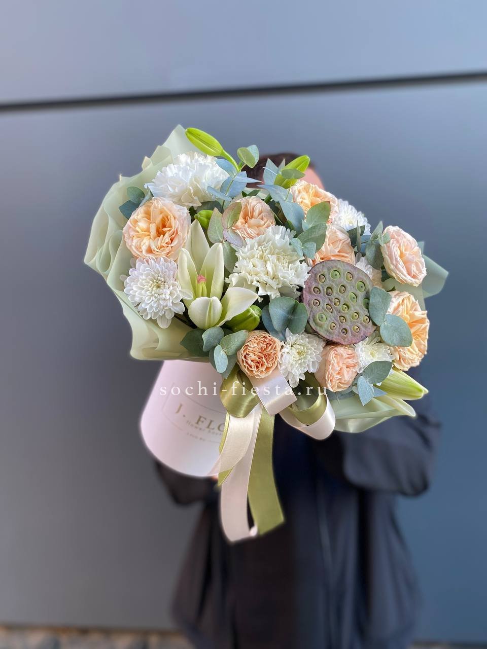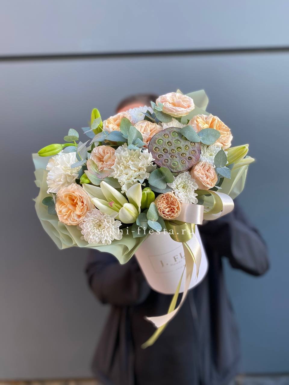 кустовая роза, лилия, диантус, лотос, эвкалипт, бокс 13.