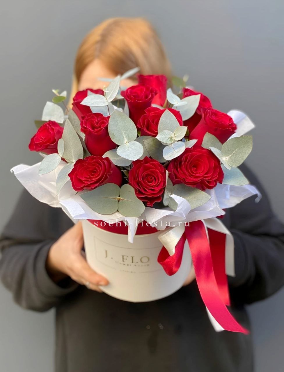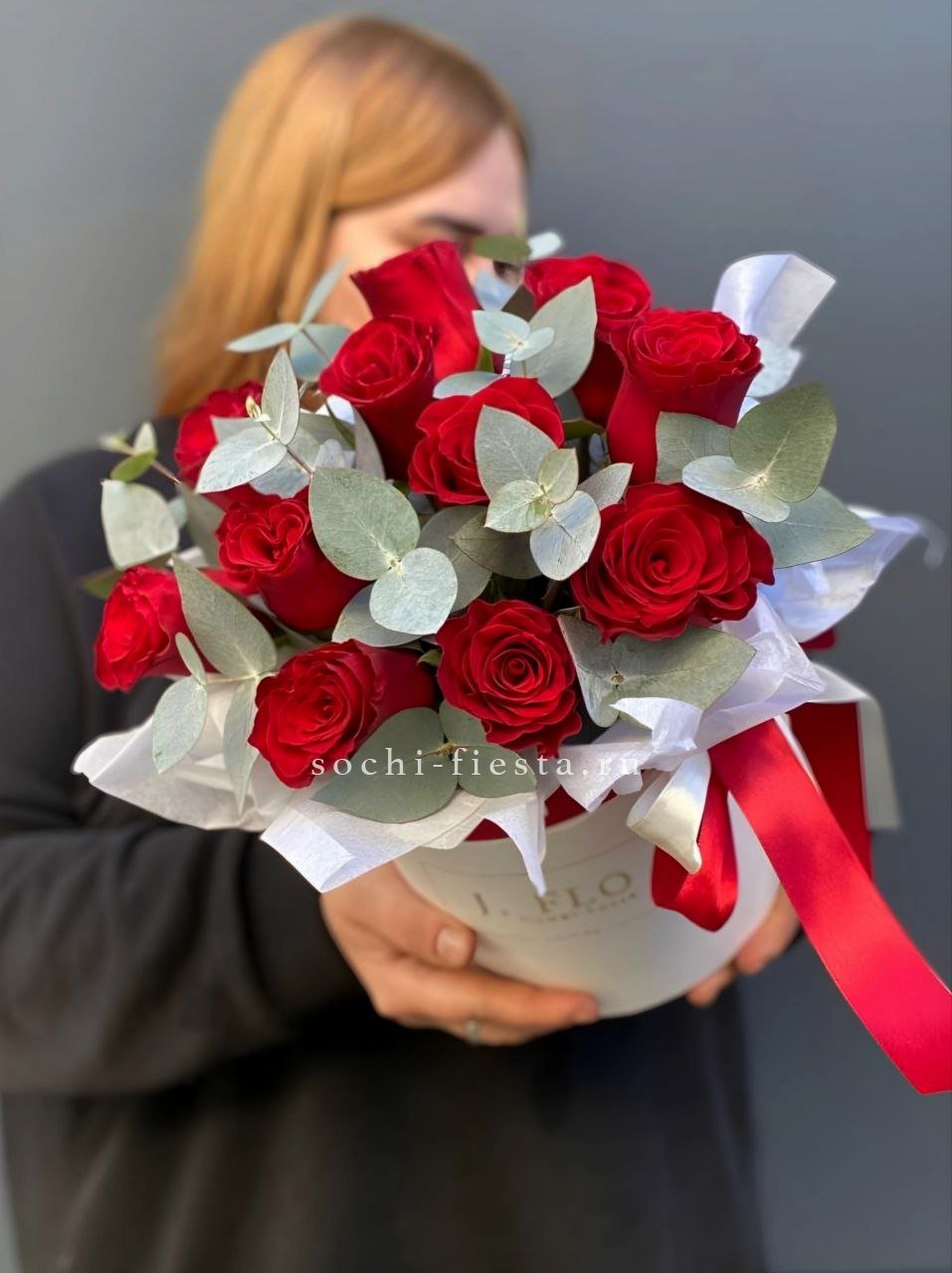 пионовидная кустовая роза Бомбастик, эвкалипт, лента, цилиндр D16.