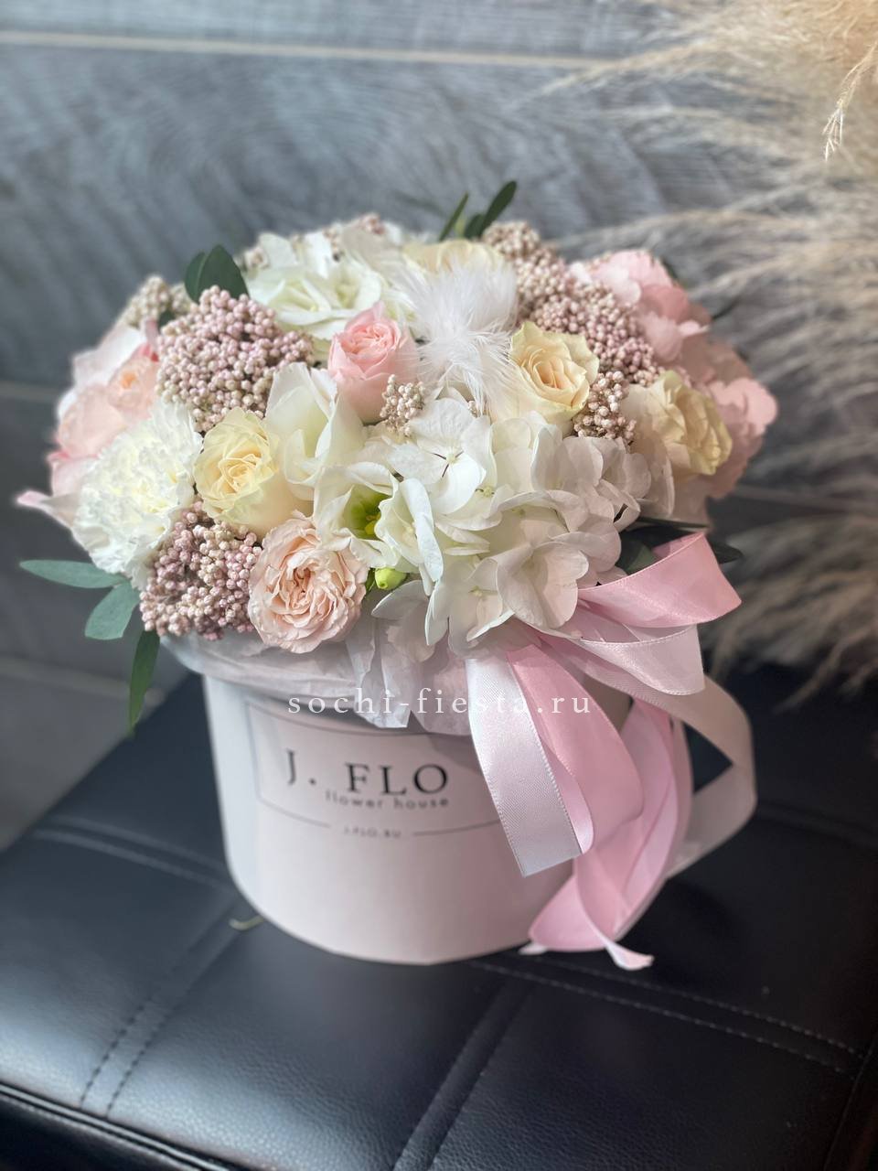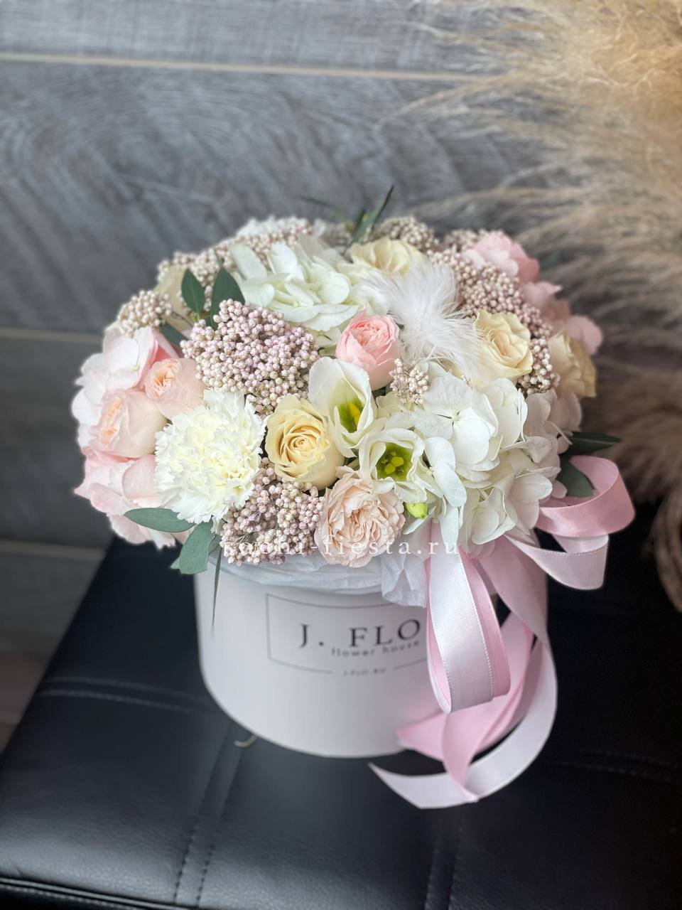 Композиция в светлом цилиндре выдержана в единой нежно-розовой палитре. Оттенки перетекают один в другой, создавая спокойное и цельное визуальное впечатление.