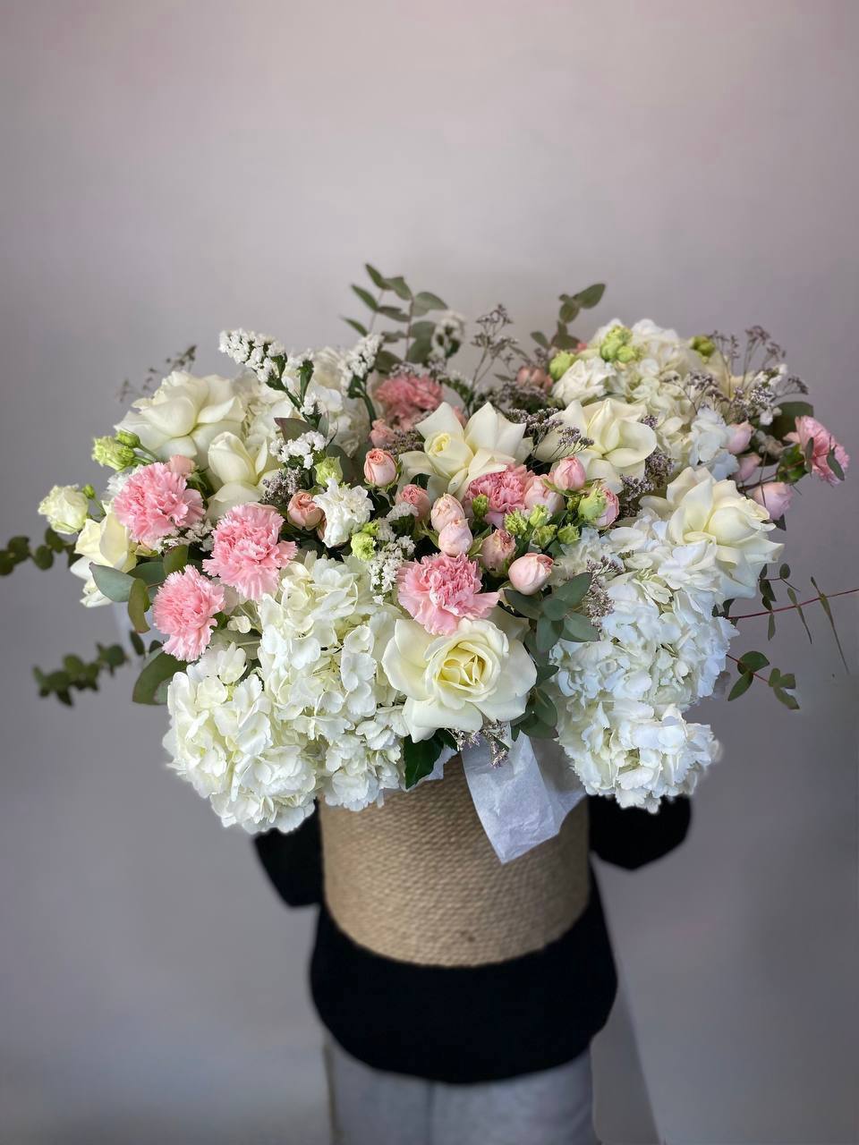 белые розы, диантусы, эустома в джутовом кашпо.