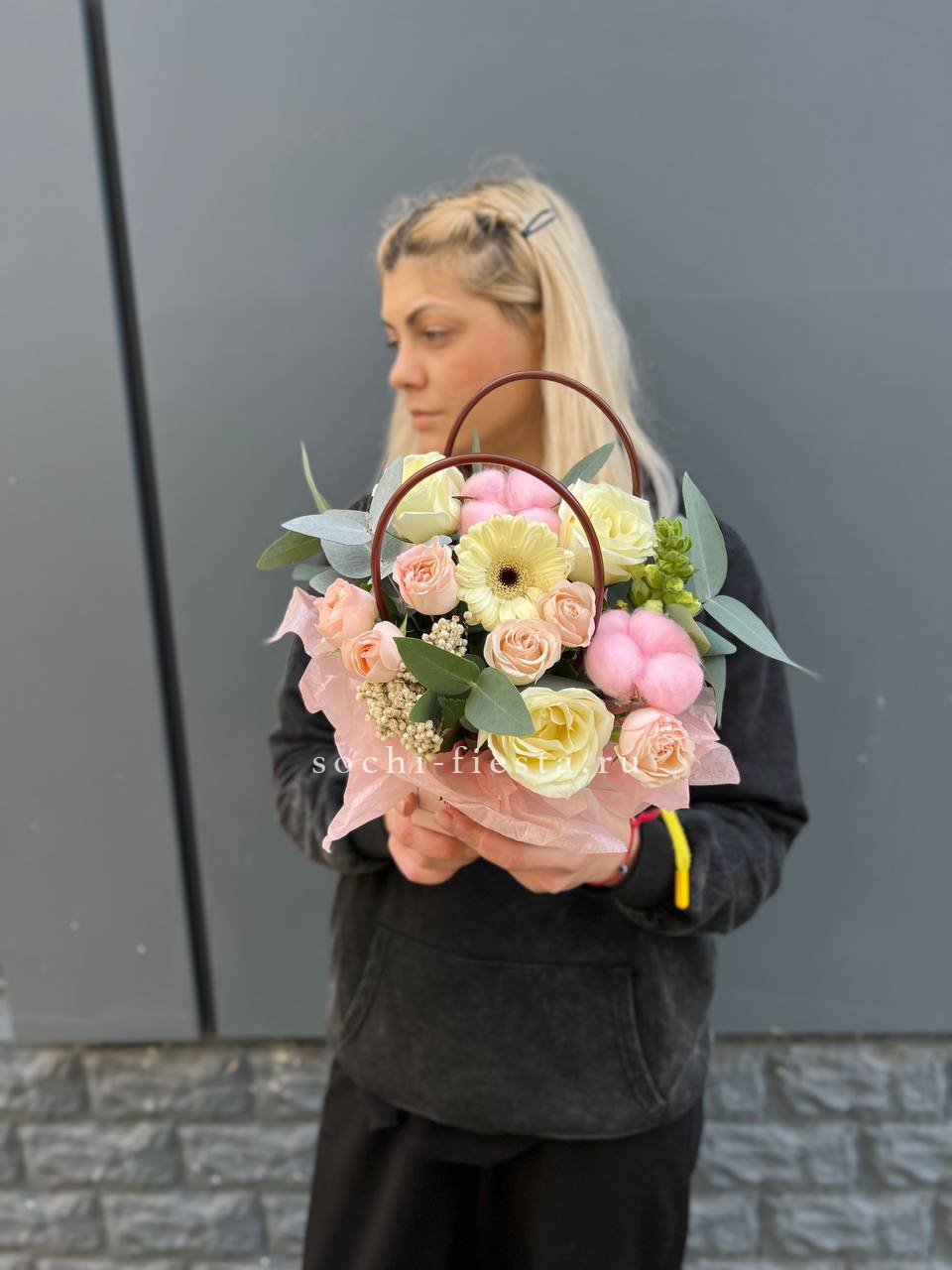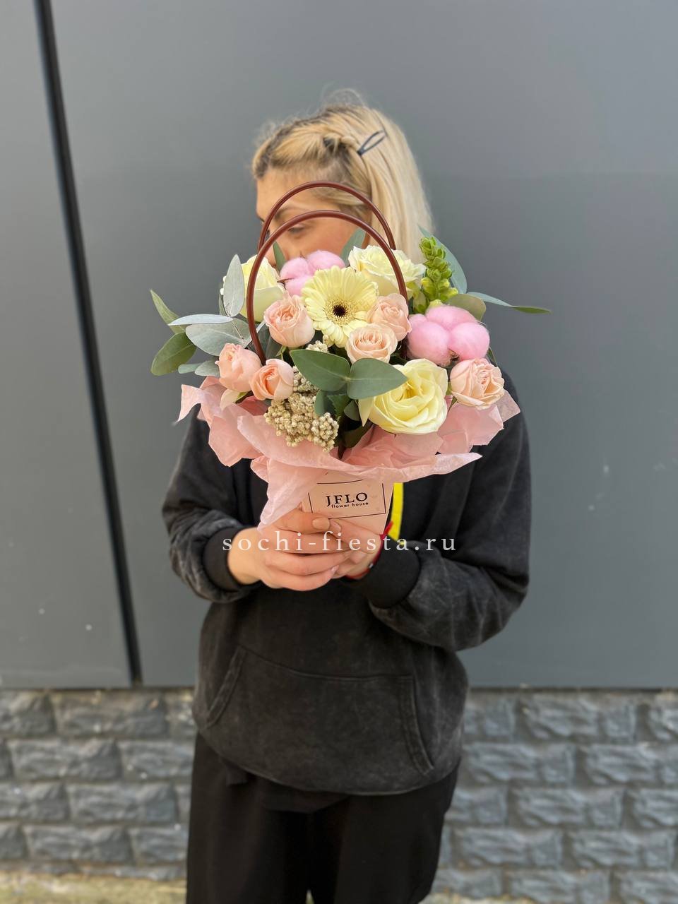 гортензия, герберы, диантусы, роза, альстромерии, эустомы, лента, эвкалипт,  сумка-кашпо.
