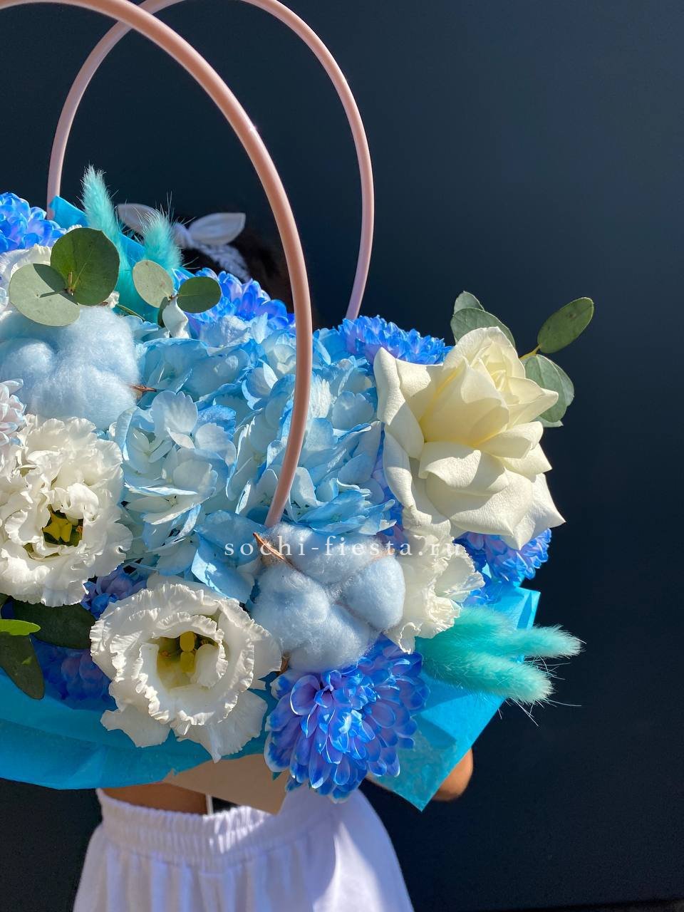 нежная композиция на базе оазиса с применением одноголовых роз, эустомы, гортензии, диантусов, эвкалипта, упаковки.