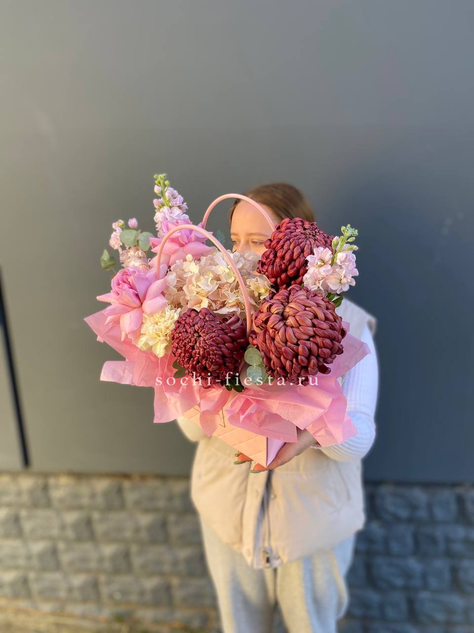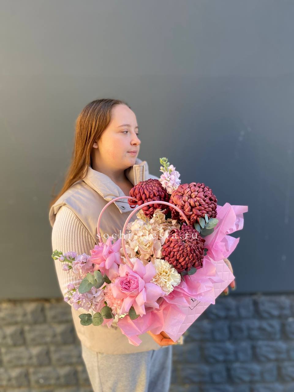 бигуди, розовые розы, гортензия, маттиола, эвкалипт, диантусы, сумочка.