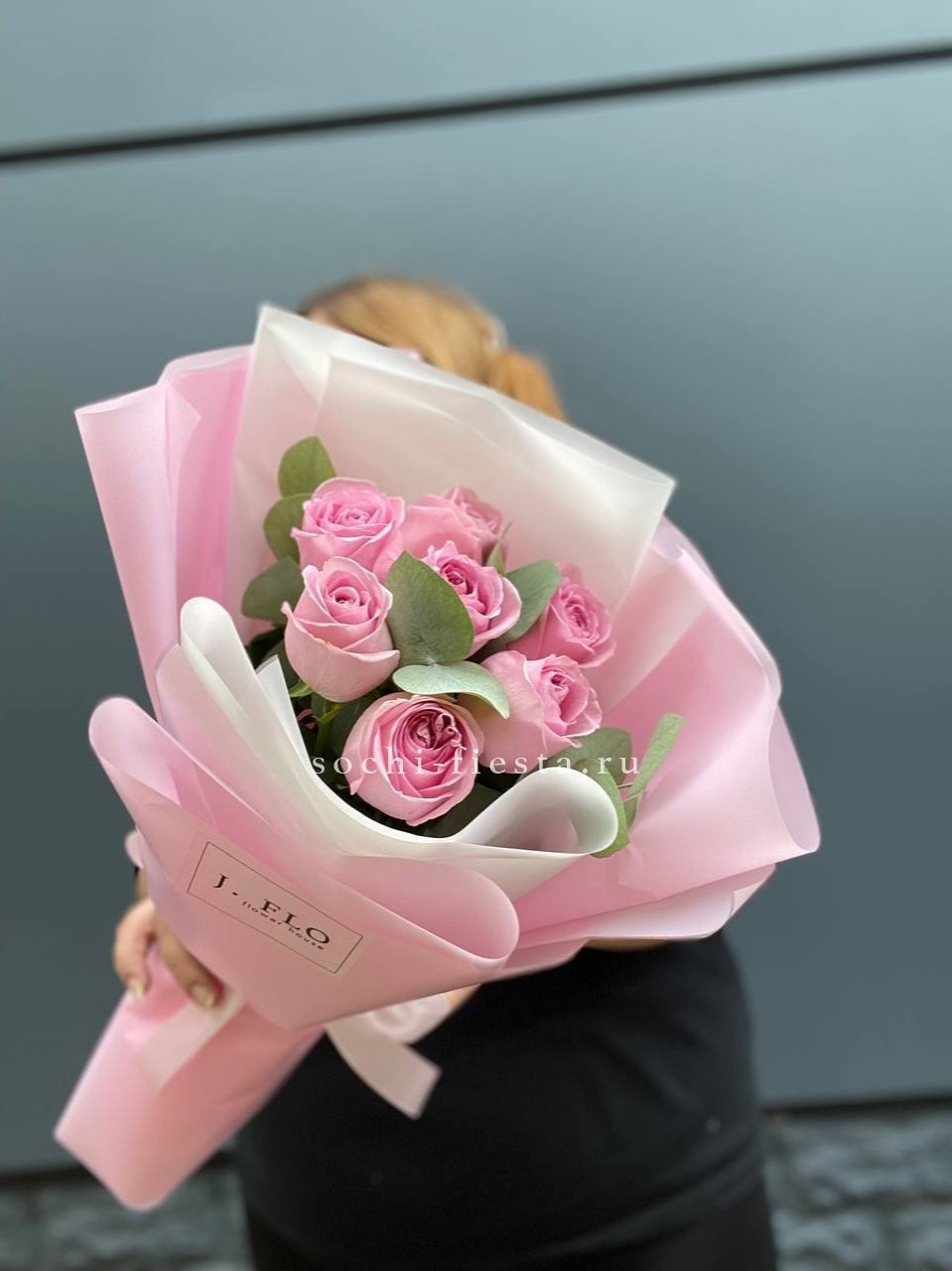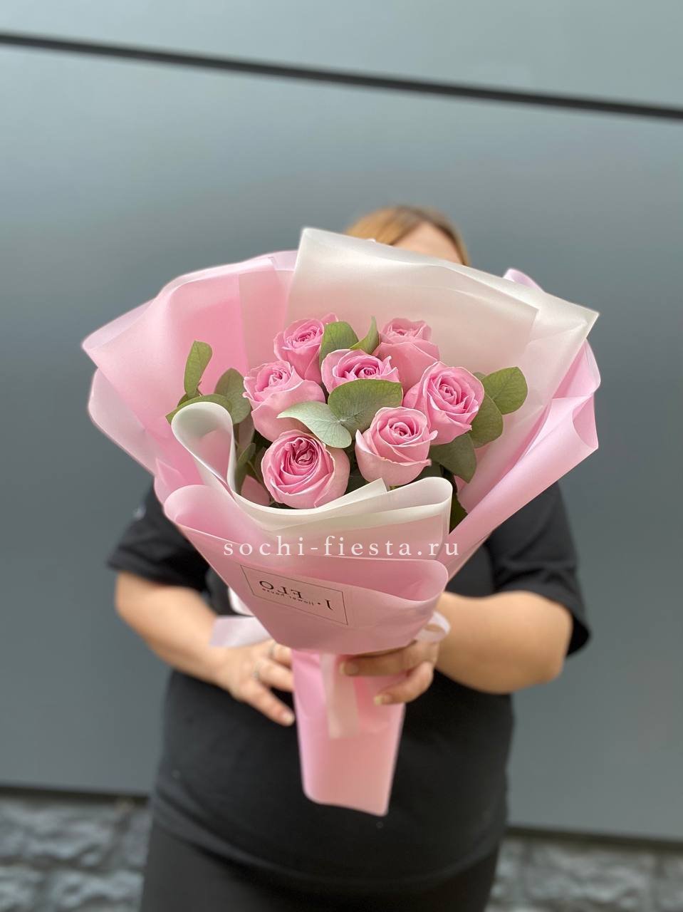 Розовые оттенки переплетаются с пыльной зеленью эвкалипта. Семь бутонов создают мягкое цветовое пятно, которое успокаивает взгляд.