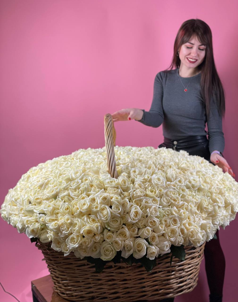 Пятьсот пятьдесят пять роз в корзине с персональной надписью — это целая инсталляция из живых цветов. Объём композиции впечатляет масштабом и создаёт незабываемое визуальное присутствие.