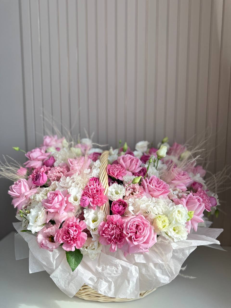 Пышная корзина с крупными бутонами роз, лилий и гортензий создаёт объёмную композицию с плавными переходами между соцветиями. Пионы добавляют воздушности и мягкости всей форме.