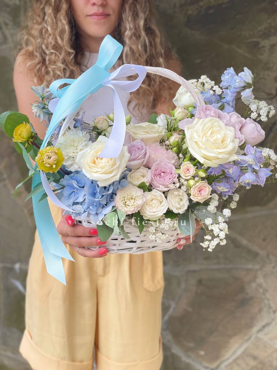 Плетёная корзина вмещает густую композицию из белых и розовых бутонов. Хризантемы и розы перемежаются с соцветиями гортензии, а статица добавляет воздушности между крупными головками цветов.