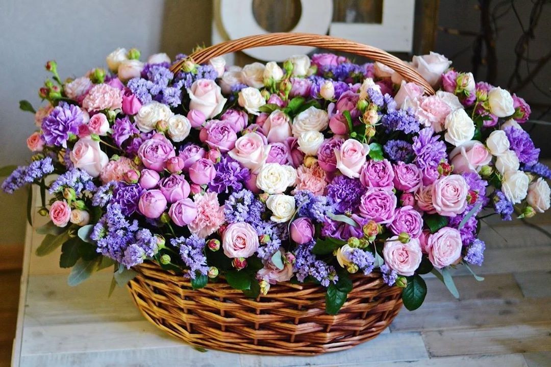 Диантусы создают воздушную текстуру, розы добавляют объем, а эустома раскрывается мягкими волнами. Композиция собрана в корзине и держит форму без лишних деталей.