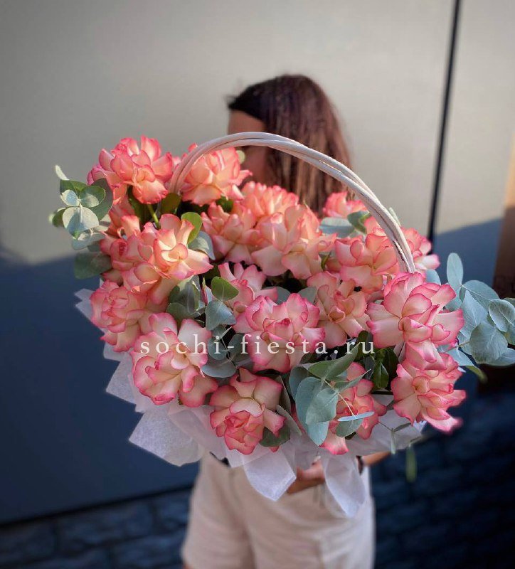 диантус, роза кустовая, гипсофила, гортензия, дельфиниум/львиный зев/маттиола (замена вне сезона), белая роза, георгины или аналог, эвкалипт, оазис, корзина D 25, двойной бант Состав композиции может быть незначительно изменен флористом в процессе изготовления с соблюдением стилистики, фактуры и цветовой гаммы оригинала.