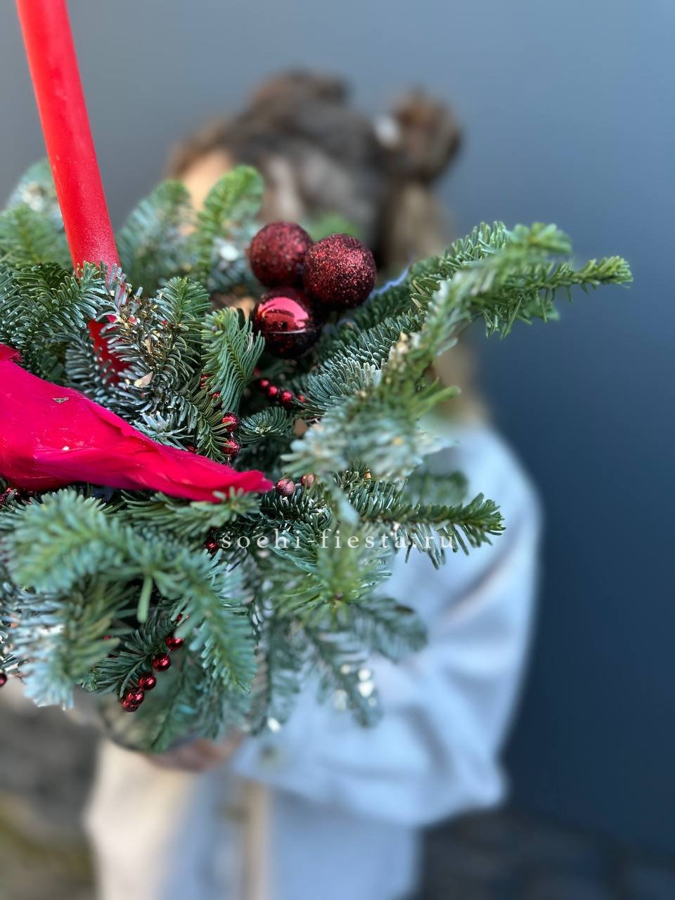 Свечи погружены в зелень нобилиса и окружены праздничными шарами. Композиция собрана в стеклянном бокале на флористическом оазисе. Завершённая форма для стола или камина.