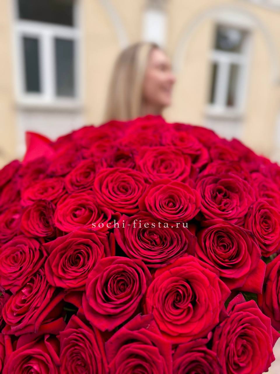 Сто один бутон насыщенного алого оттенка собраны в плотную охапку. Классика жанра в масштабном исполнении для тех моментов, когда слова не нужны.